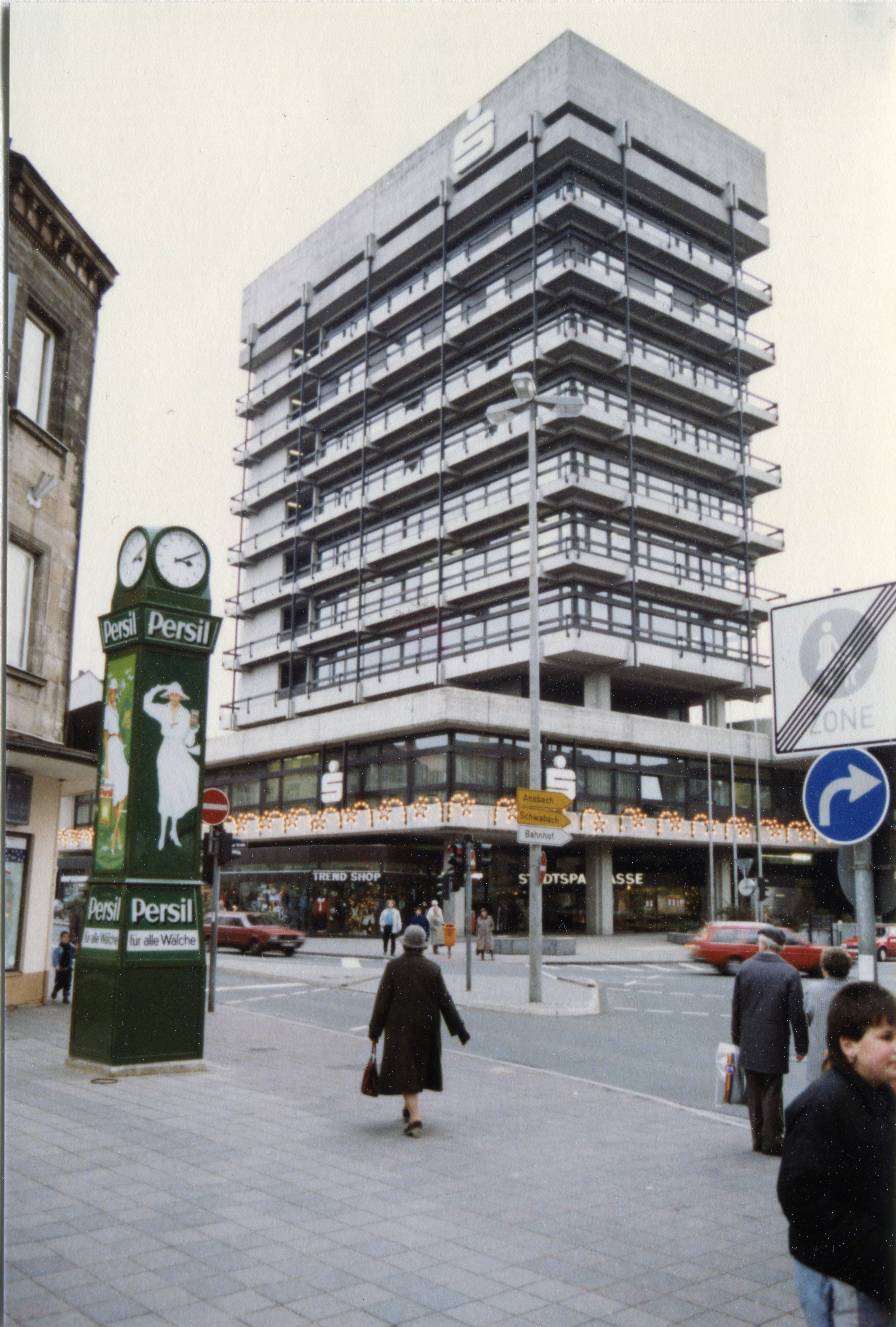 | Beschreibung | Blick von der Fußgängerzone vor dem Kaufhaus Bilka und Persiluhr zum Hochhaus der Stadtsparkasse im Dezember 1988 | ||