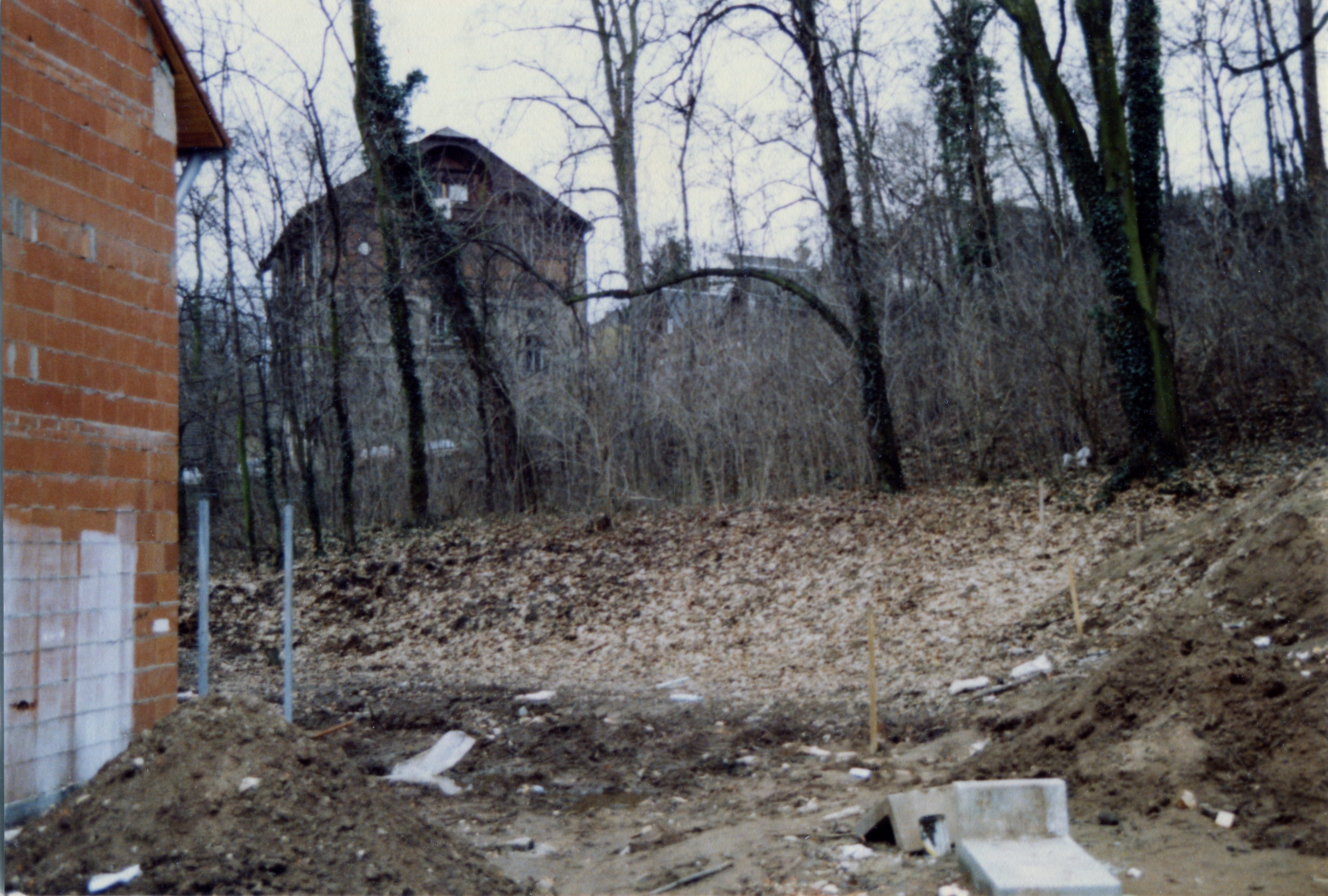 | Beschreibung | Baumaßnahmen im ehem. Grüner Park - im Hintergrund die alte Villa Jakob-Henle-Straße 38 - im April 1989 | ||