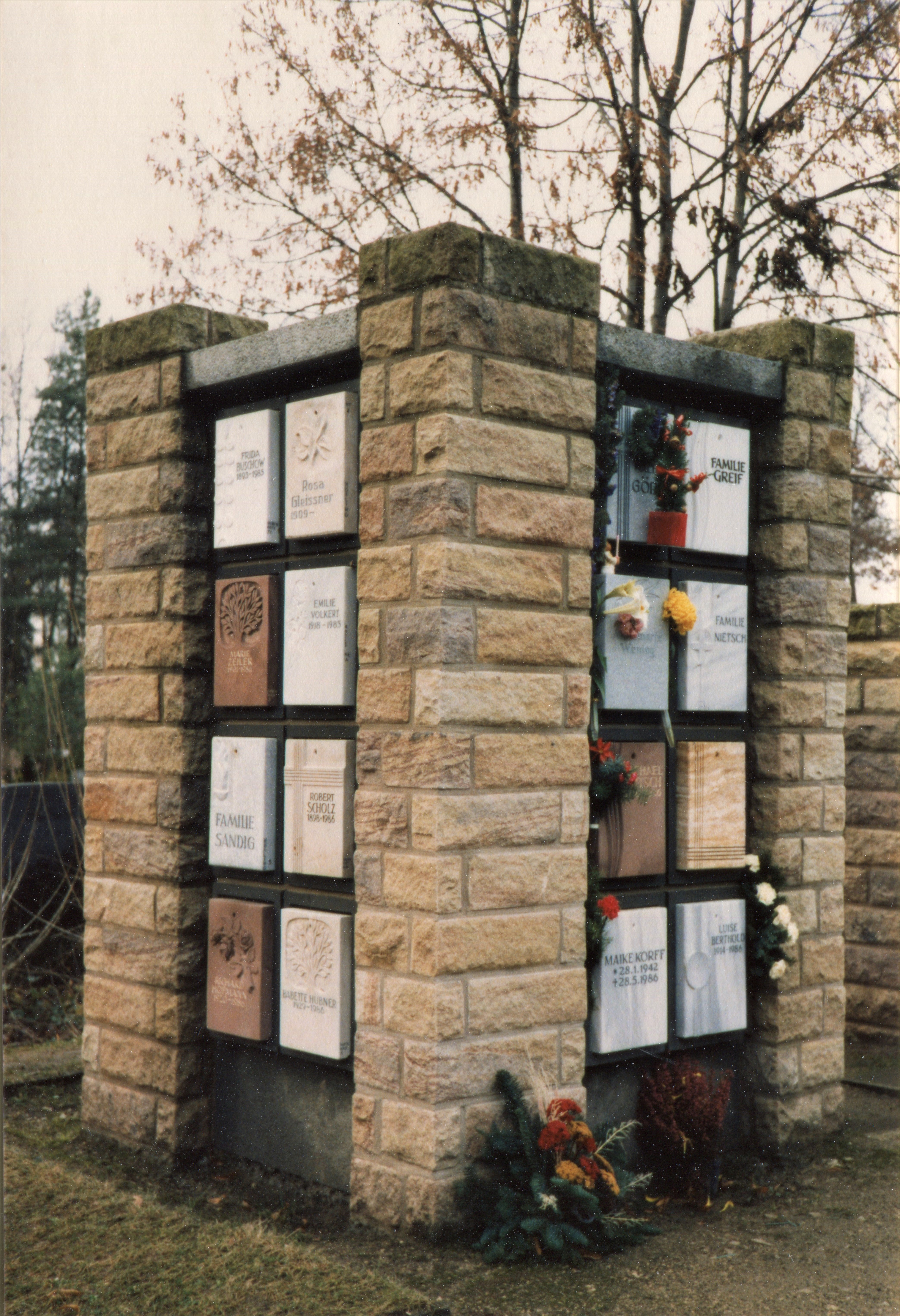 | Dateiinfo (Bild-Unterschrift und Info-Box, automatisch erstellt) | Urnengräber Fürther Friedhof am 5.1.1988 Urheber: Klaus-Peter Schaack<br><br>Lizenz: CC BY-SA 3.0 | ||