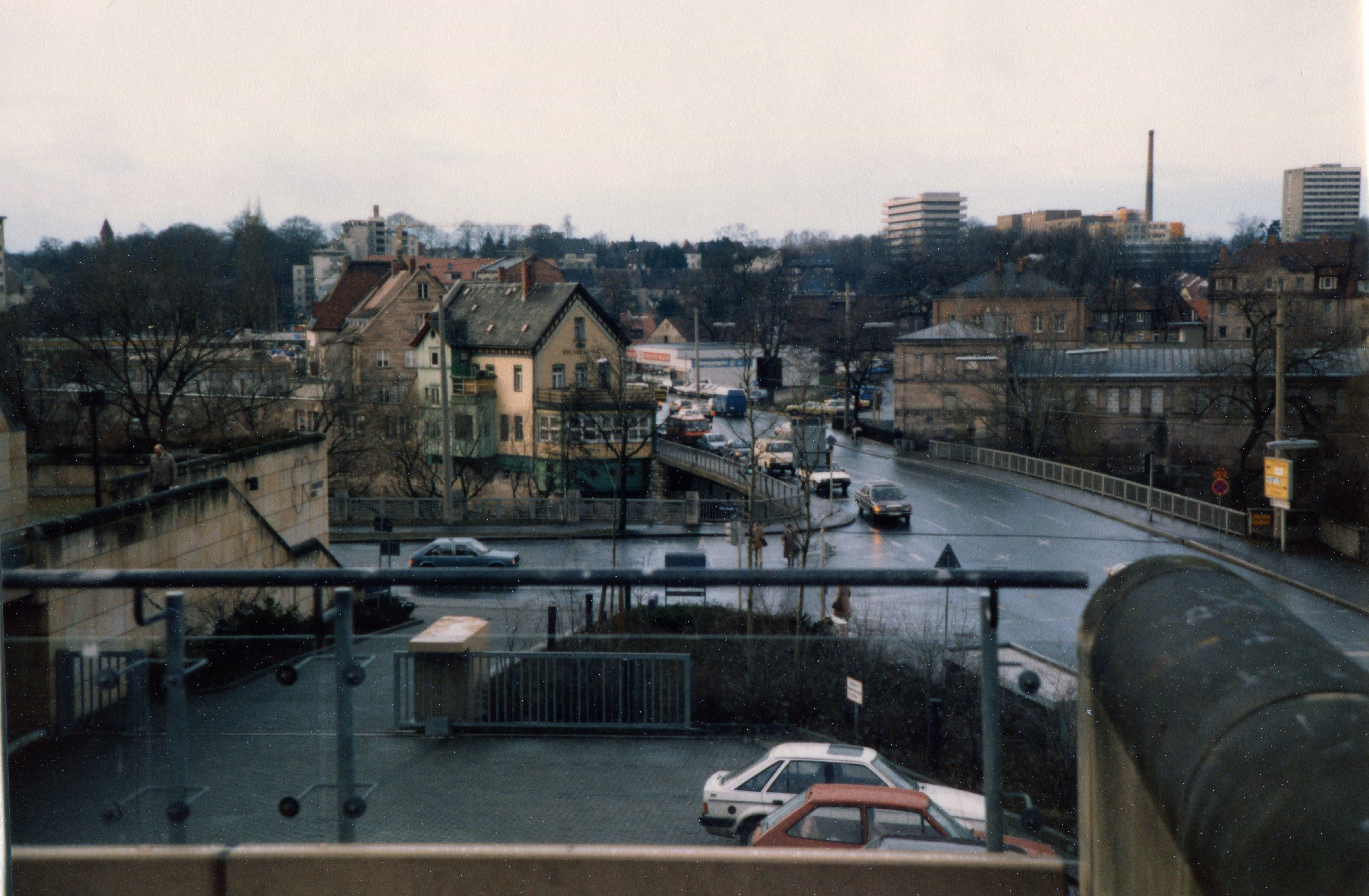 | Beschreibung | Blick von der Stadthalle über die Uferstraße, ehem. Maxbrücke und Fischhäusla. Rechts Alter Schlachthof, heute Kulturforum. Im Hintergrund rechts die ehem. Kinderklinik und Klinikum Fürth am 5.1.1988 | ||