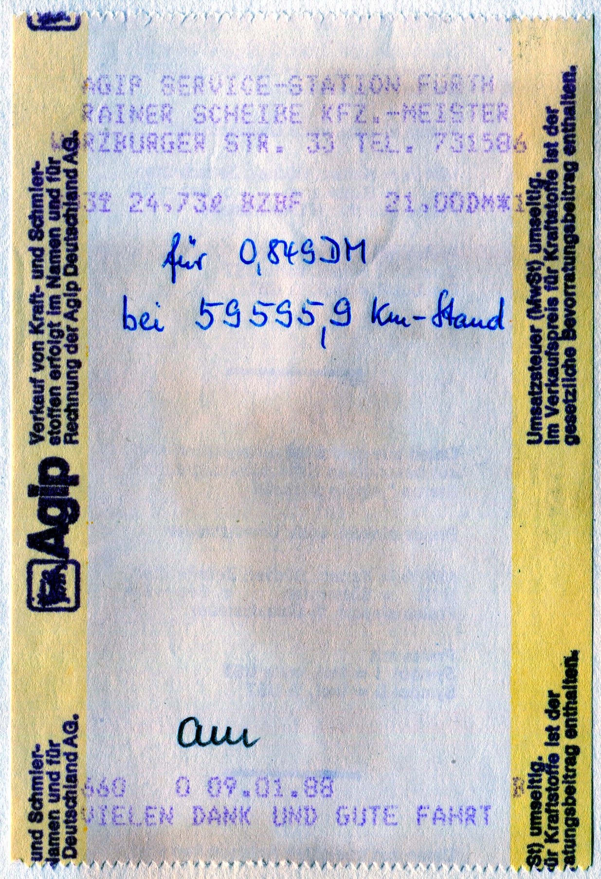 | Beschreibung | Tankrechnung vom Jan 1988 der damaligen Agip Tankstelle mit einem (heutigen) traumhaften Literpreis von 0,43 € | ||