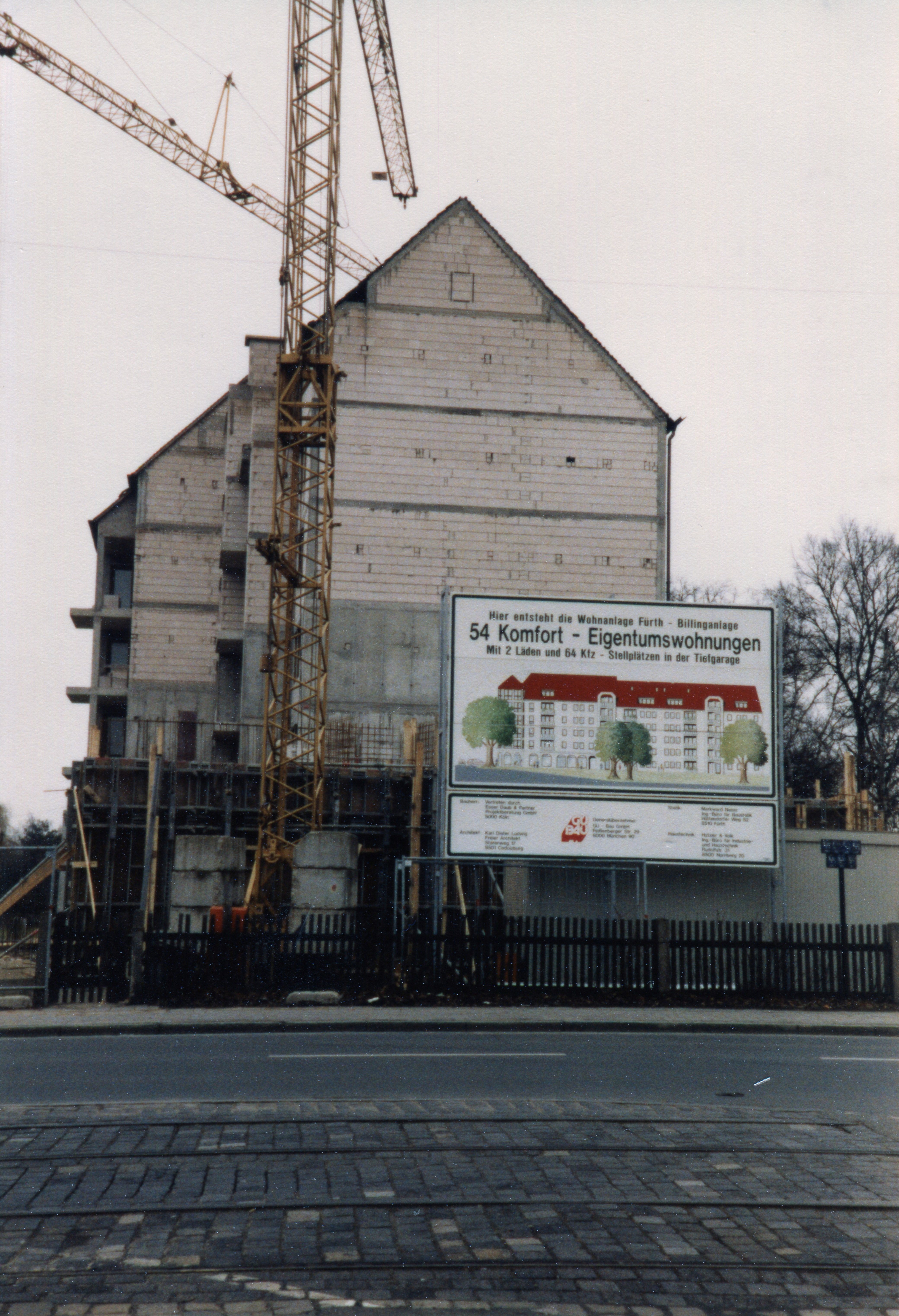 | Beschreibung | neu erbautes Wohn- und Geschäftshaus Billinganlage 2, 4, 6, 8 im Februar 1988. Der eine Flügel am Wiesengrund ist fertiggestellt. | ||