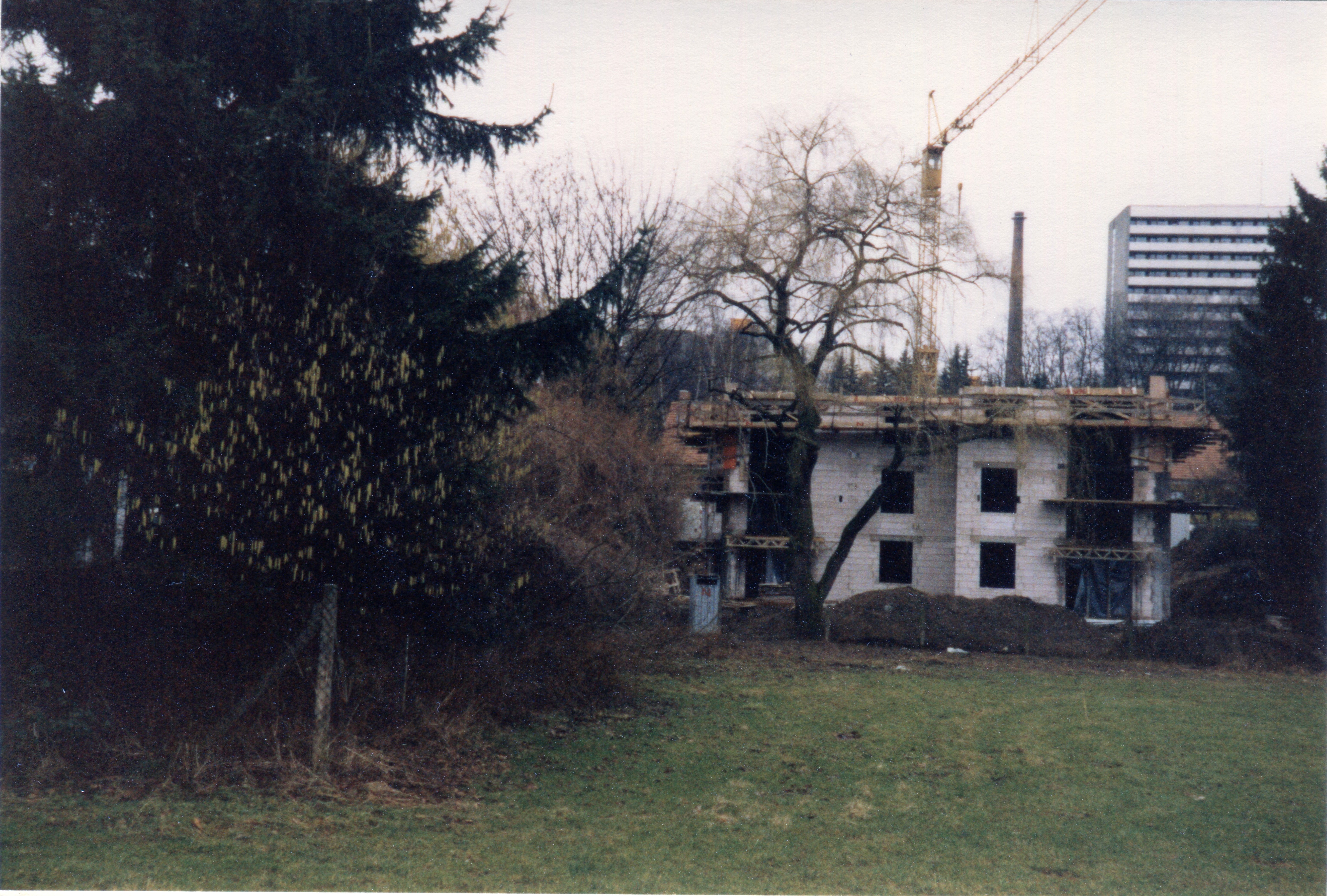 | Beschreibung | Baumaßnahmen im ehem. Grüner Park im Februar 1988. Rechts Hochhaus Gebäude vom Klinikum Fürth. | ||