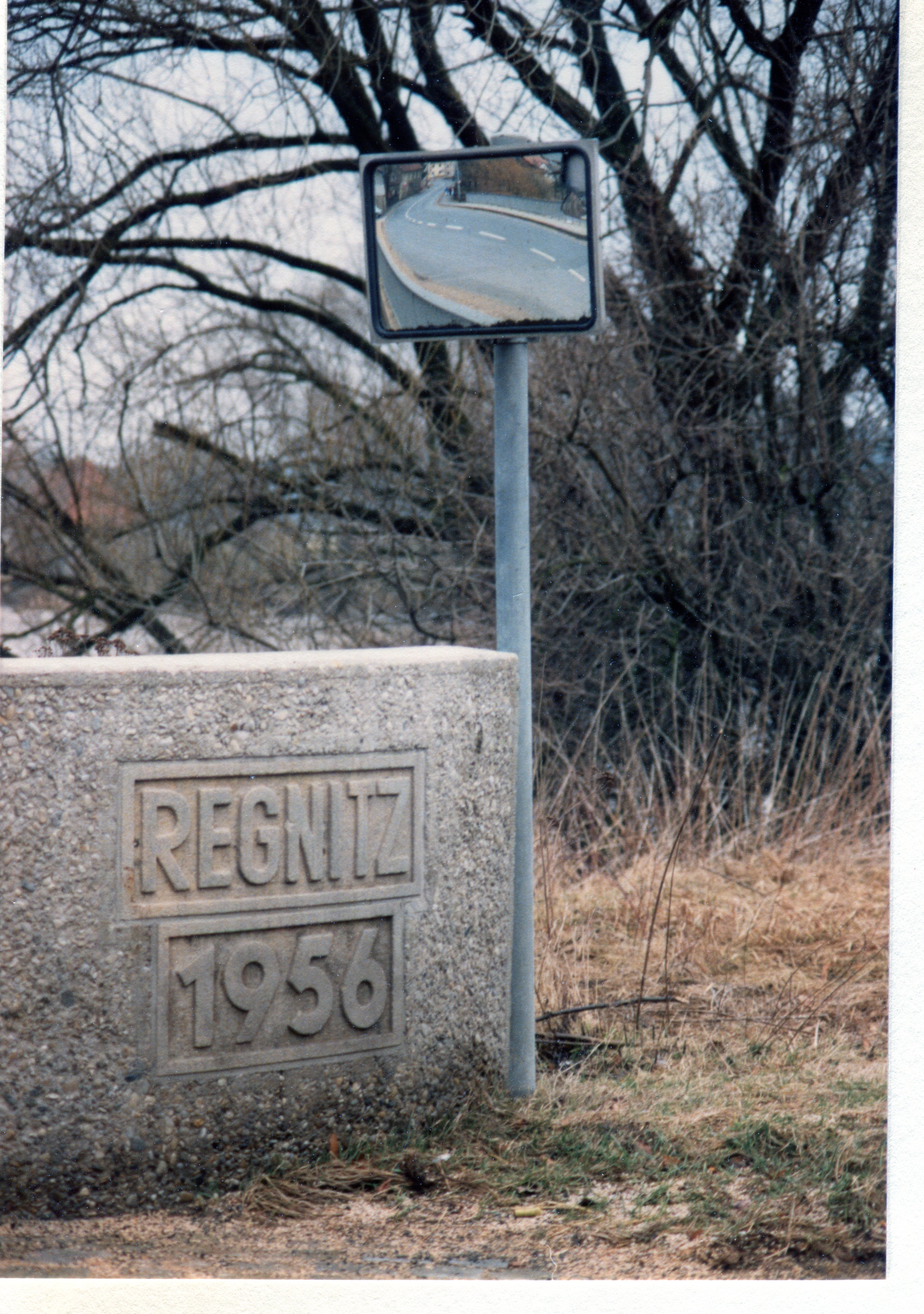 | Beschreibung | Inschrift an der Vacher Regnitzbrücke, im Spiegel die Brückenstraße, Feb. 1987 | ||