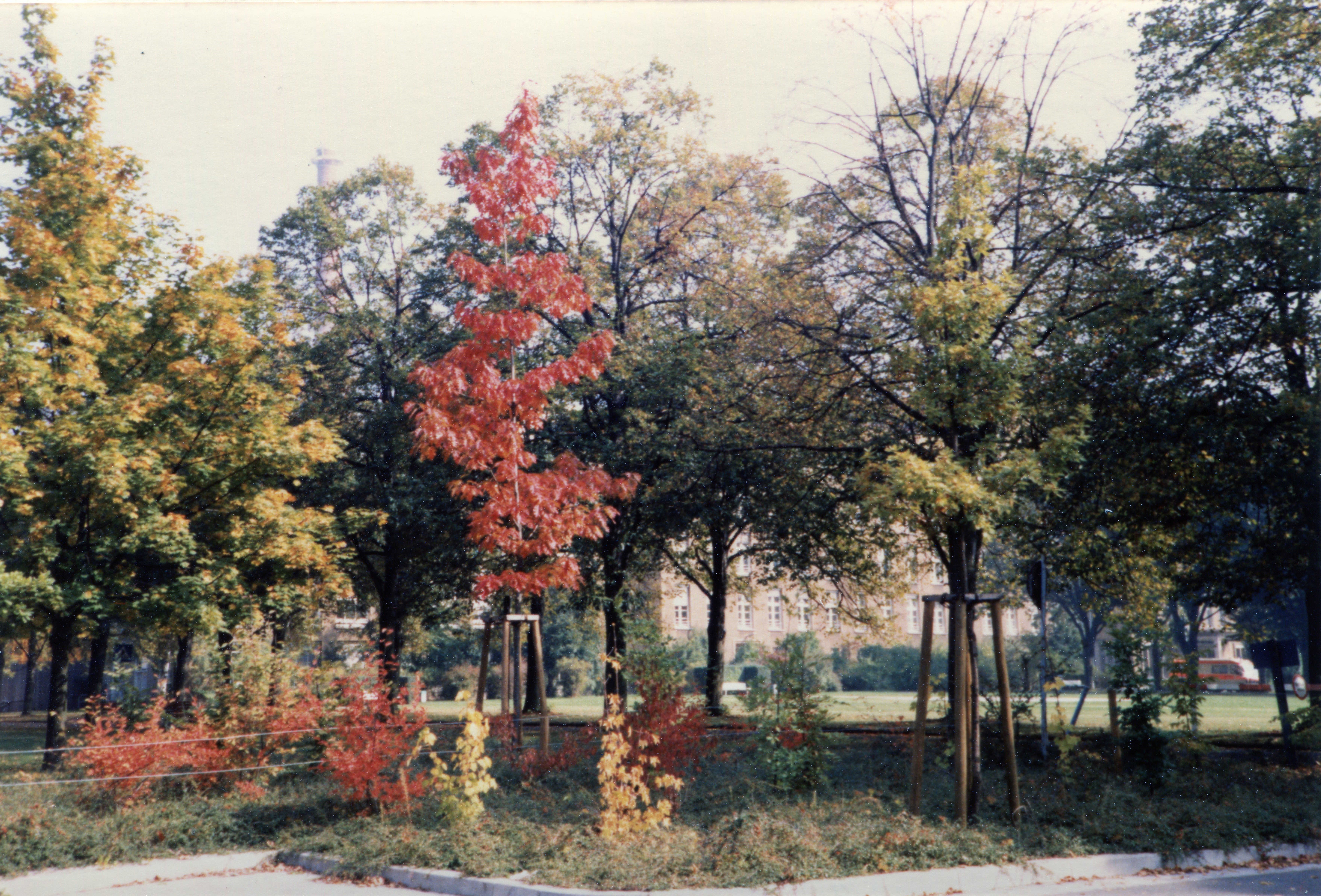 | Beschreibung | Blick auf das Klinikum Hauptgebäude mit Hubschrauberlandeplatz mit viel alten Baumbestand am 24.9.1986 | ||