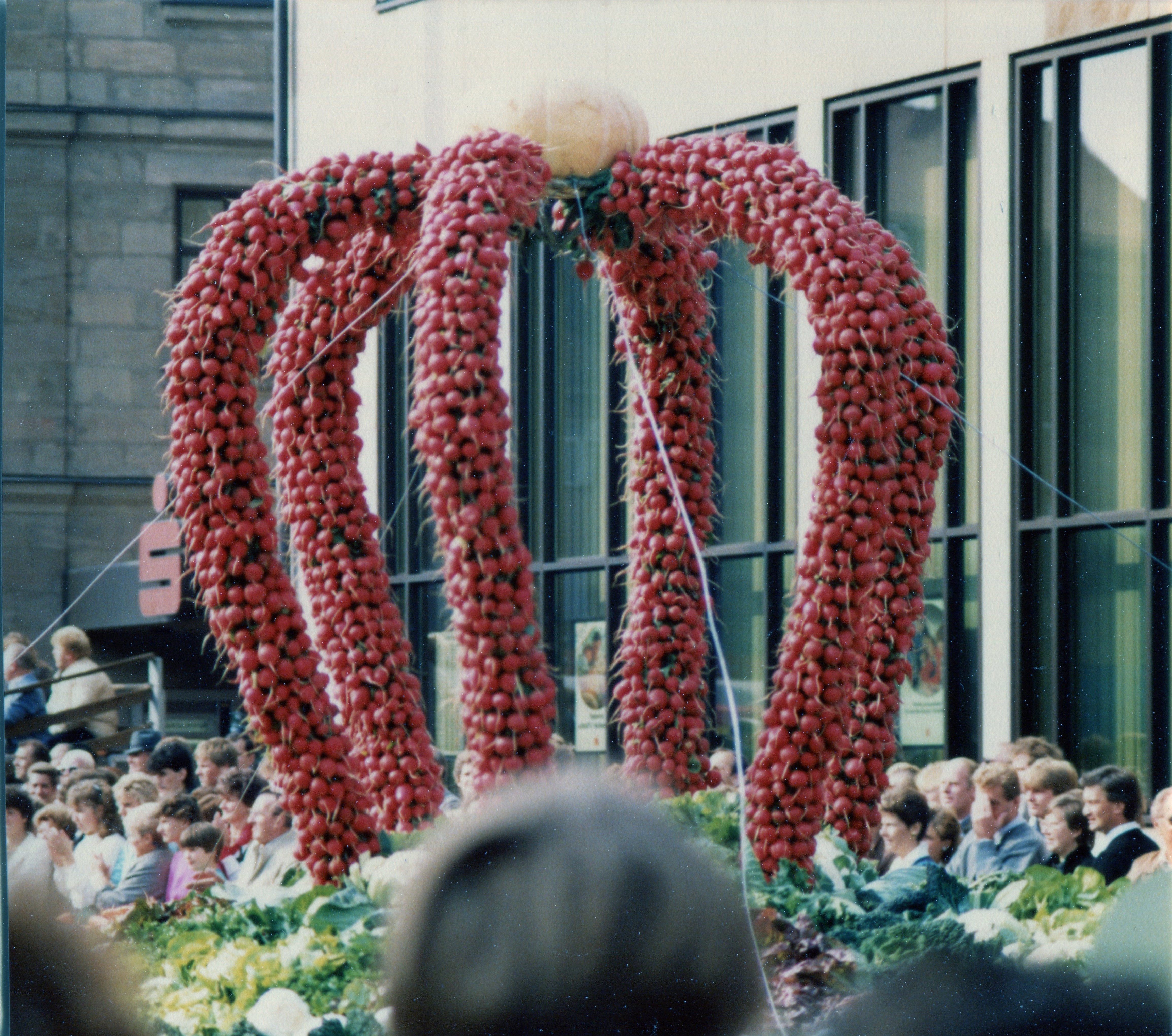 | Dateiinfo (Bild-Unterschrift und Info-Box, automatisch erstellt) | Erntedankumzug zur Michaelis-Kirchweih am Königsplatz, Festwagen mit Erntekrone, Oktober 1986 Urheber: Klaus-Peter Schaack<br><br>Lizenz: CC BY-SA 3.0 | ||