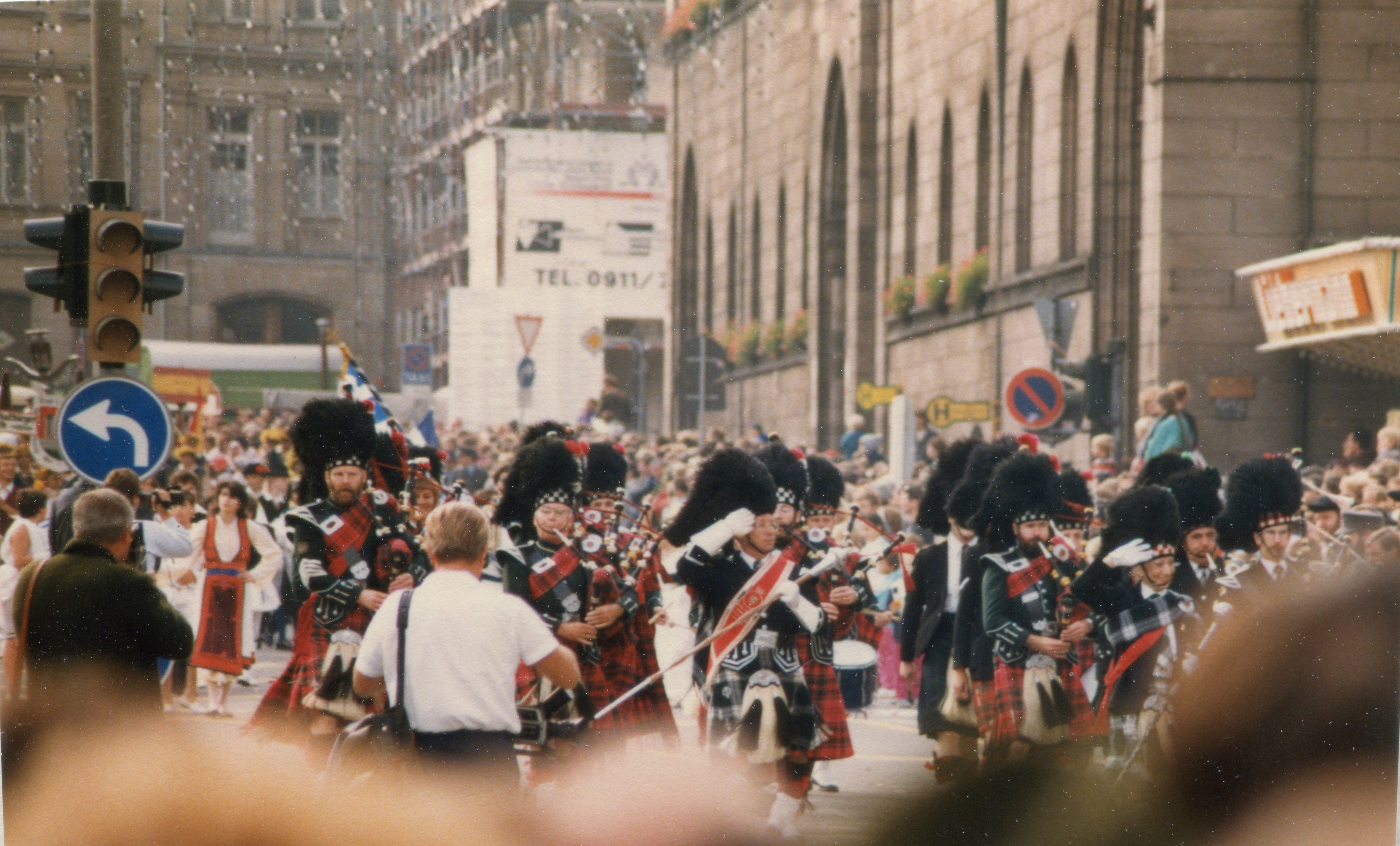 | Beschreibung | Erntedankumzug zur Michaelis-Kirchweih am Königsplatz mit schottischen Dudelsackklängen, Oktober 1986 | ||