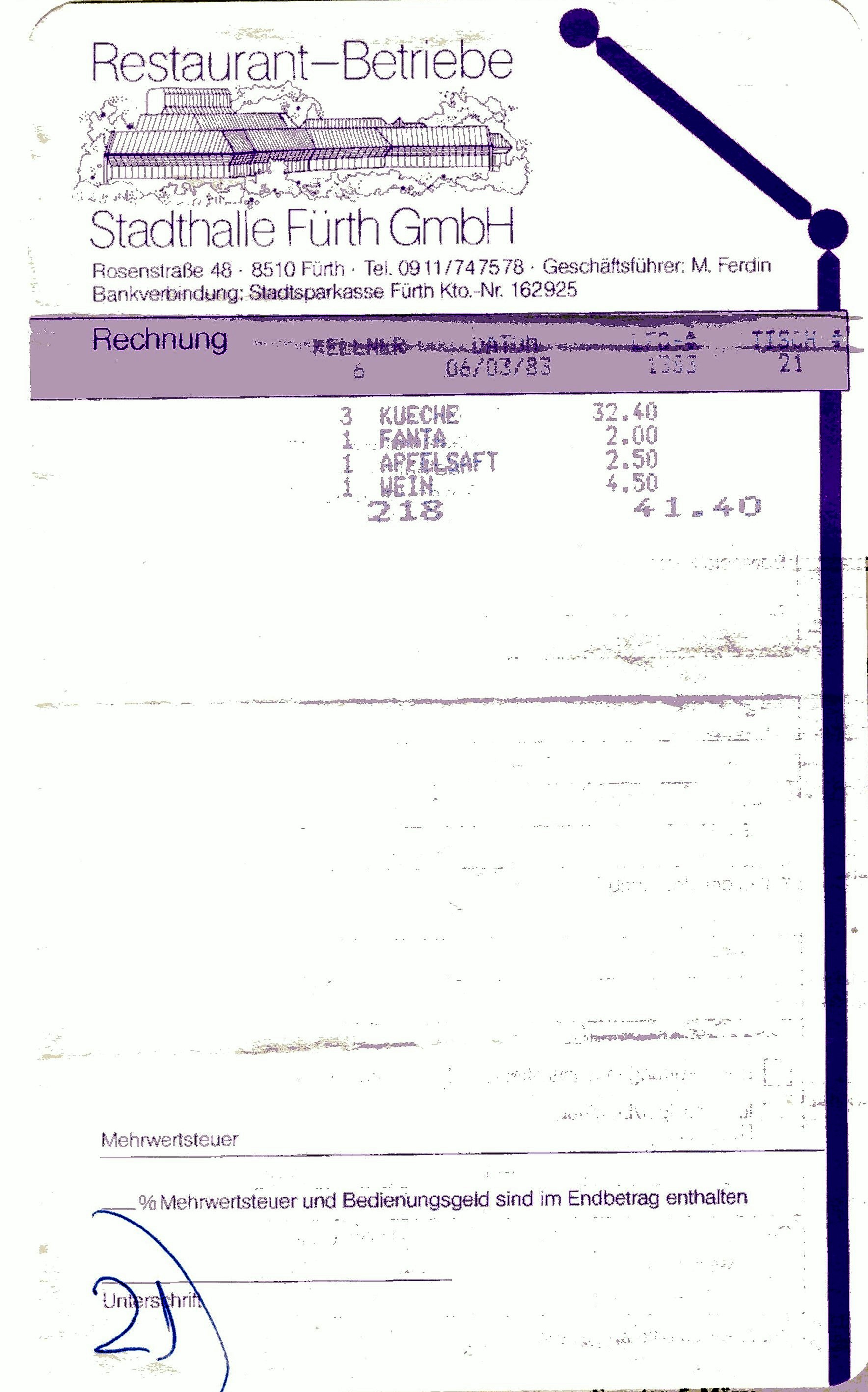 | Dateiinfo (Bild-Unterschrift und Info-Box, automatisch erstellt) | Rechnung vom Restaurantbesuch in der Stadthalle vom März 1983 Urheber: Restaurantbetriebe Stadthalle<br><br>Lizenz: CC BY-SA 3.0 | ||