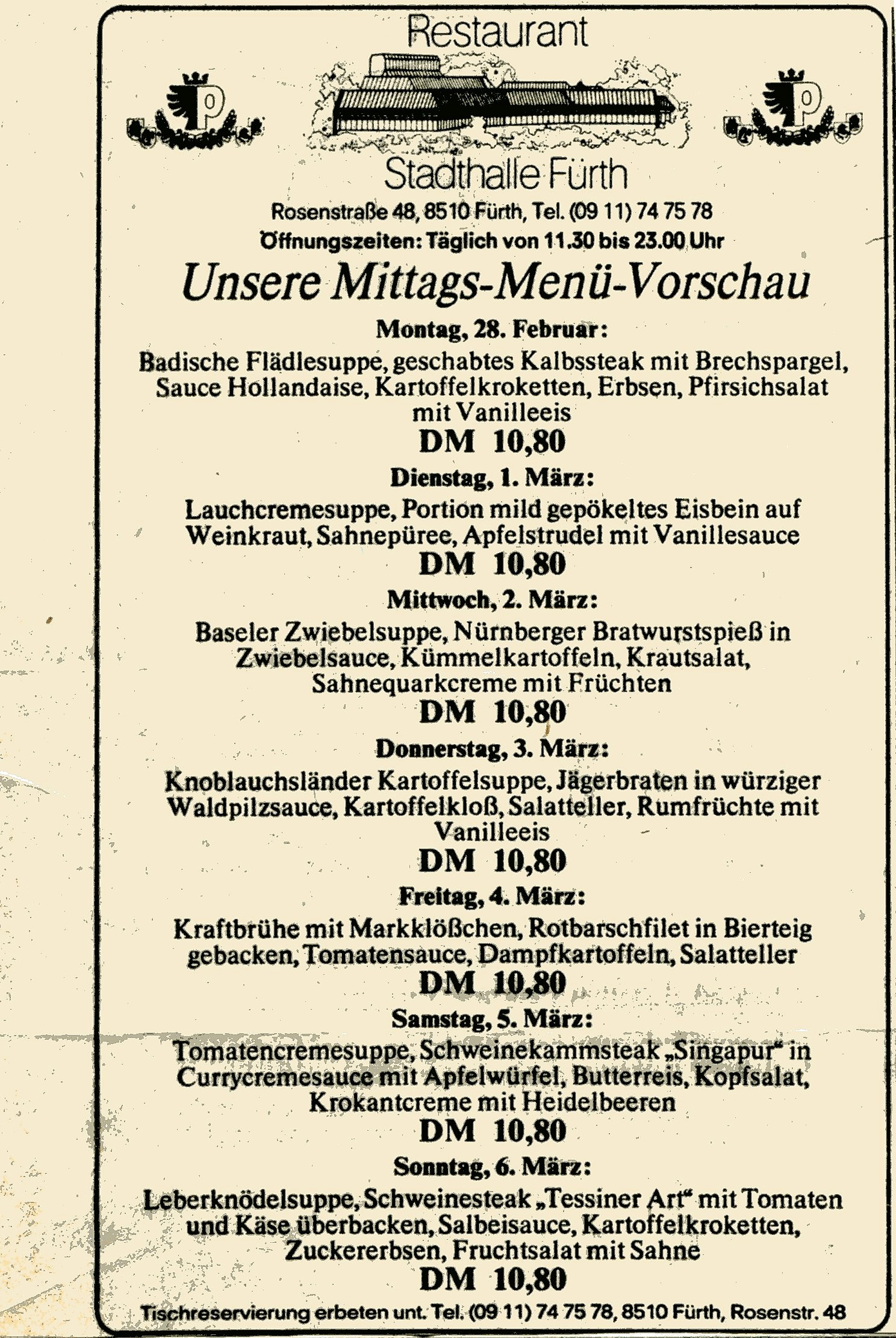 | Beschreibung | Zeitungsinserat mit Mittags Menu Vorschlag des Stadthallen Restaurant vom Februar 1983 | ||