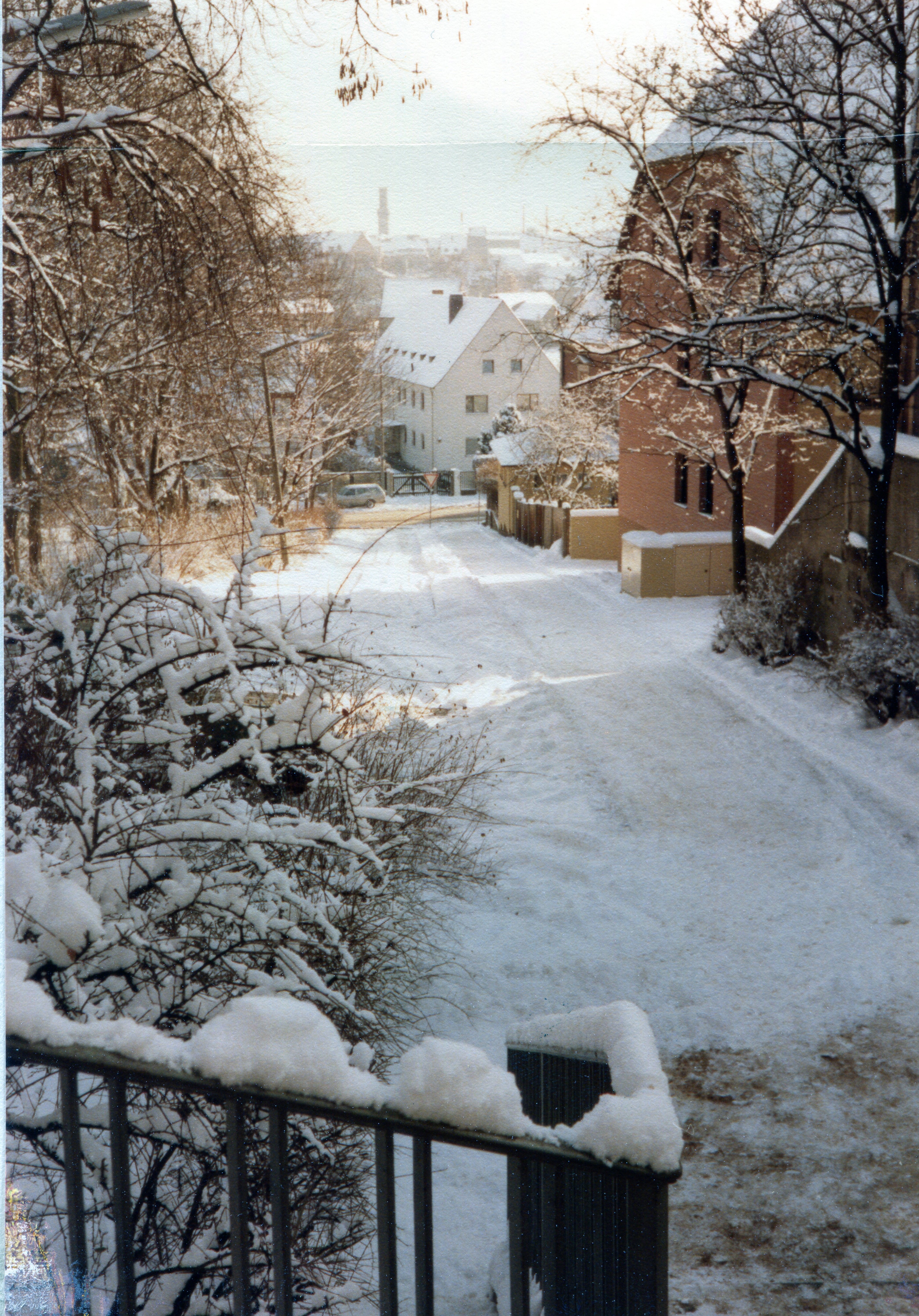 | Beschreibung | Blick vom Treppenaufgang zum Stadtkrankenhaus über die Jakob-Henle-Straße zur Vacher Straße im Januar 1985 | ||