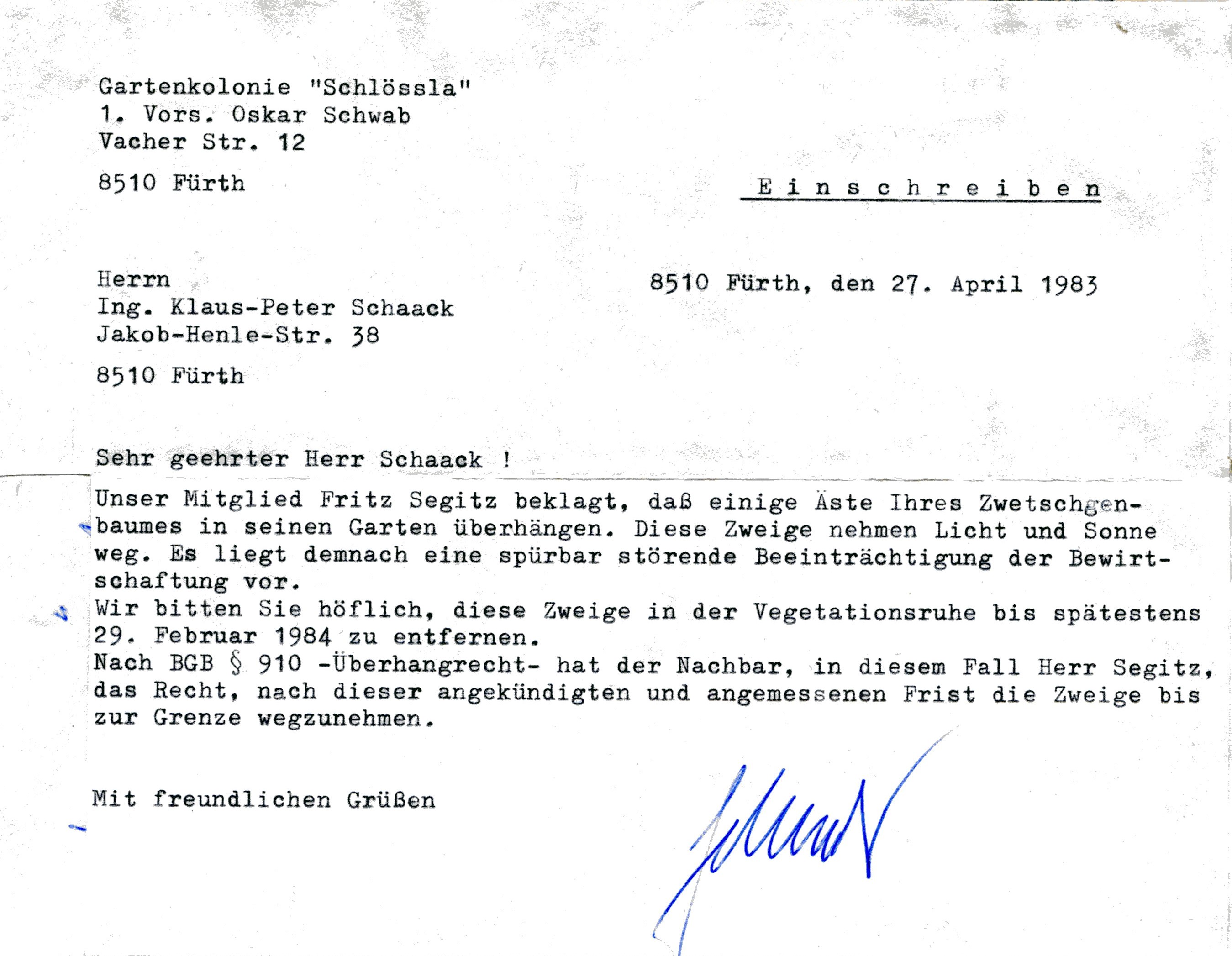 | Beschreibung | Beschwerdebrief der Kleingartenkolonie Schlössla an Nachbarn Schaack wegen "Schattenwurf einiger Äste" im April 1983 | ||