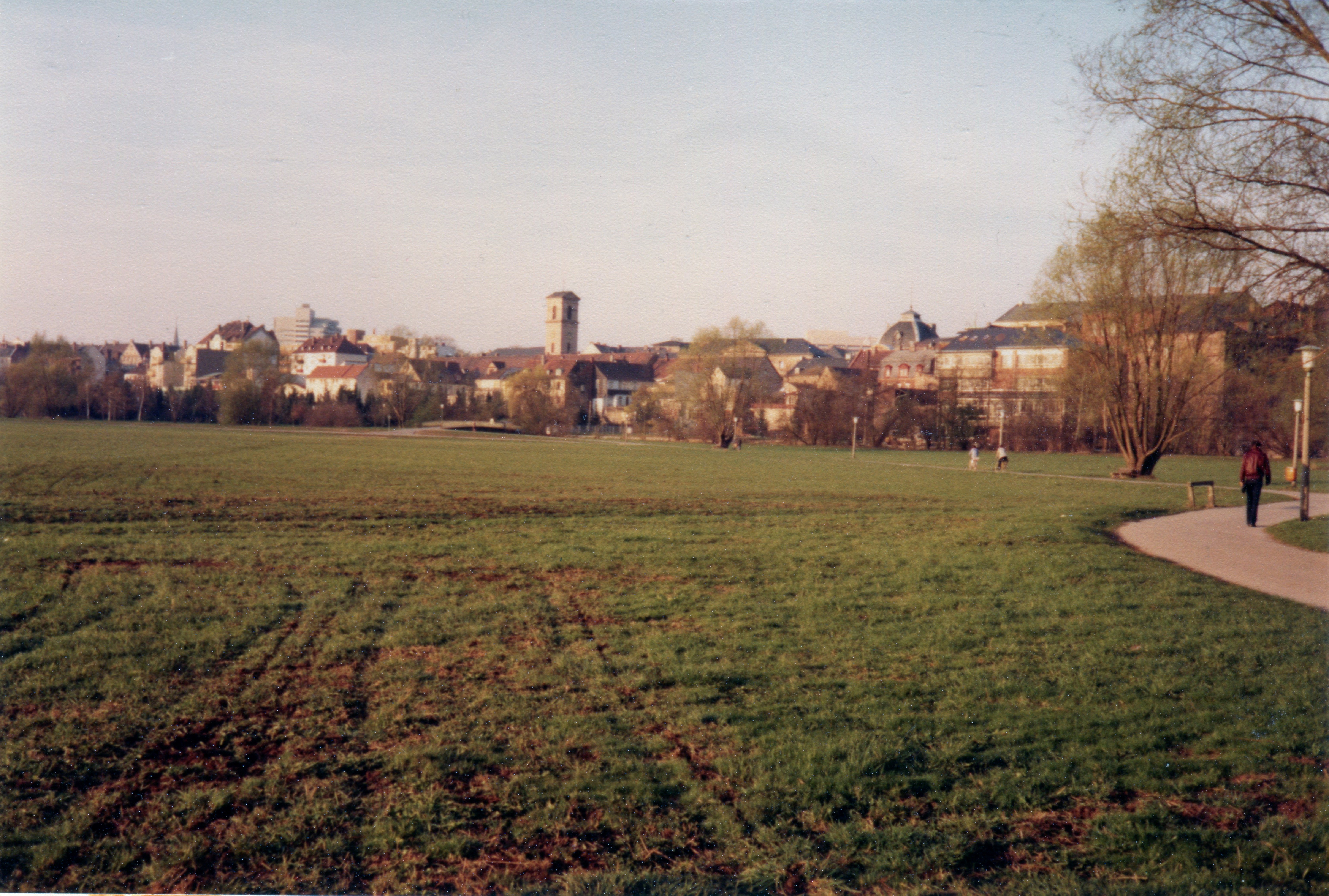 | Beschreibung | Pegnitz Radweg am Ulmenweg mit Stadttheater Kuppel von rechts, dann Turm der Kirche „Zu Unserer Lieben Frau“ und Hochhaus vom Bahnhof-Center im April 1982 | ||