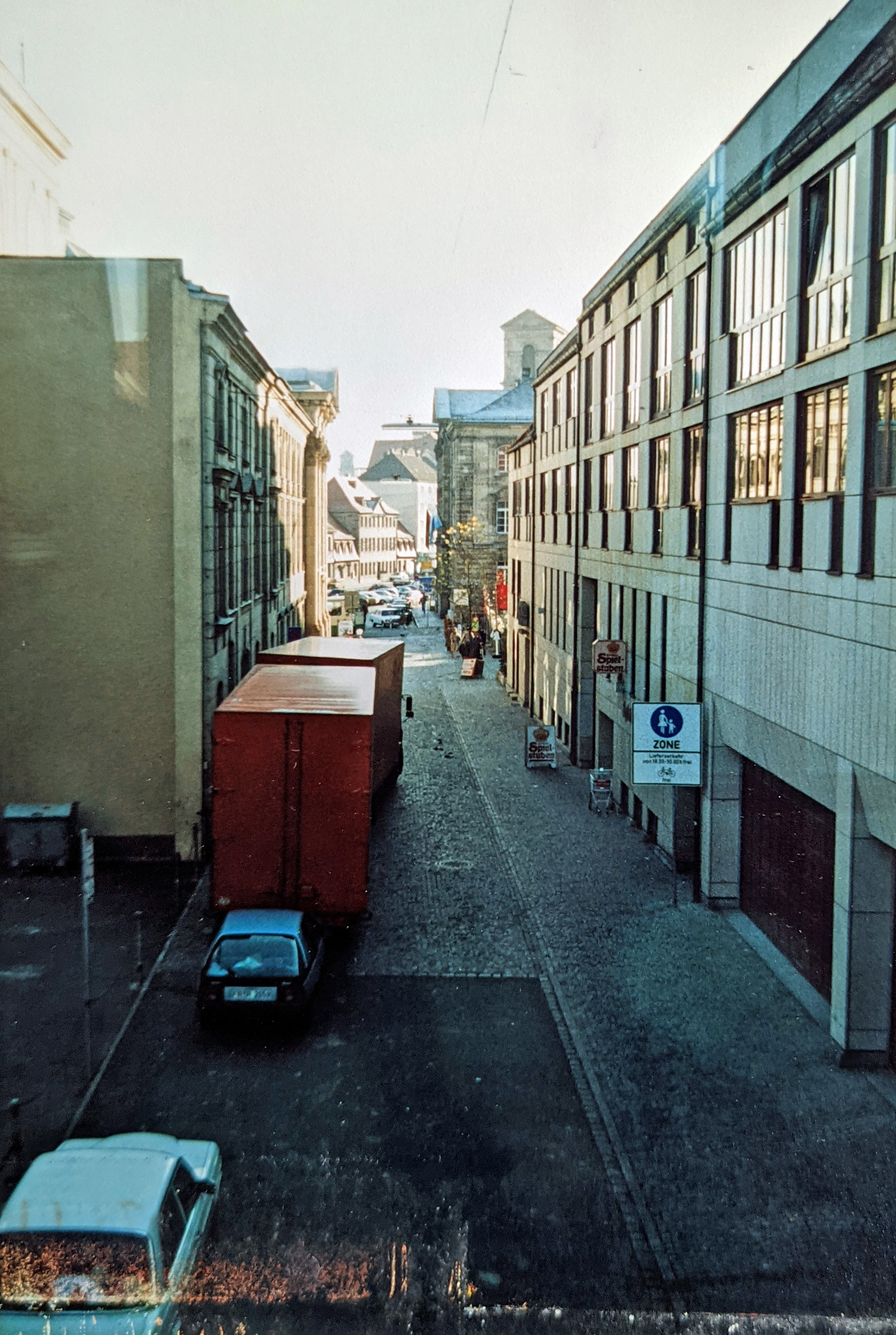 | Beschreibung | Blick über die Bäumenstraße zum Hallplatz, Dezember 1990 | ||