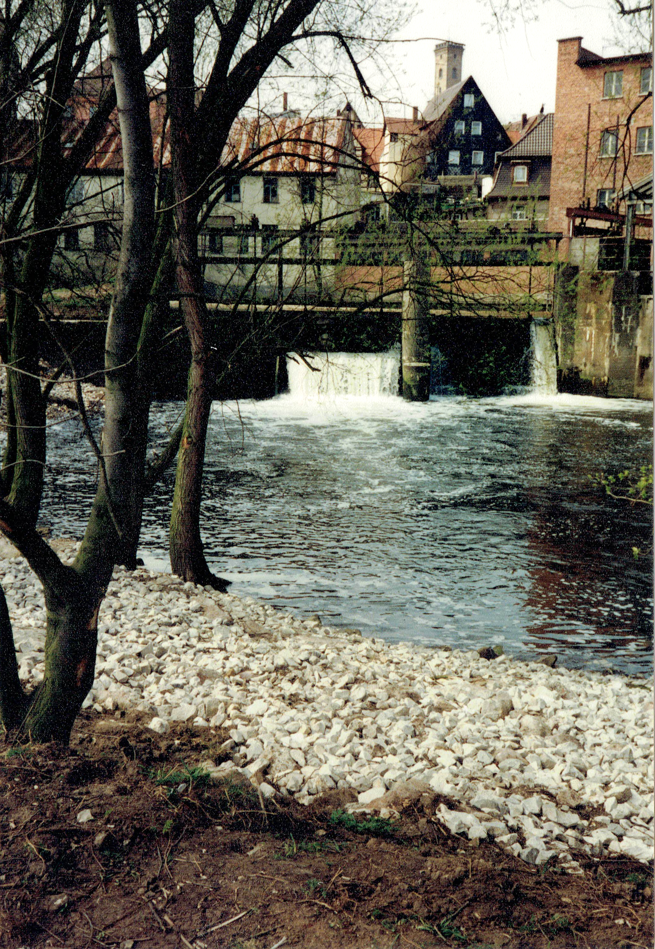| Beschreibung | Wolfsgrubermühle - vor dem Rathaus im Hintergrund die dunkle Fassade der Mühlstraße 24, April 1992 | ||
