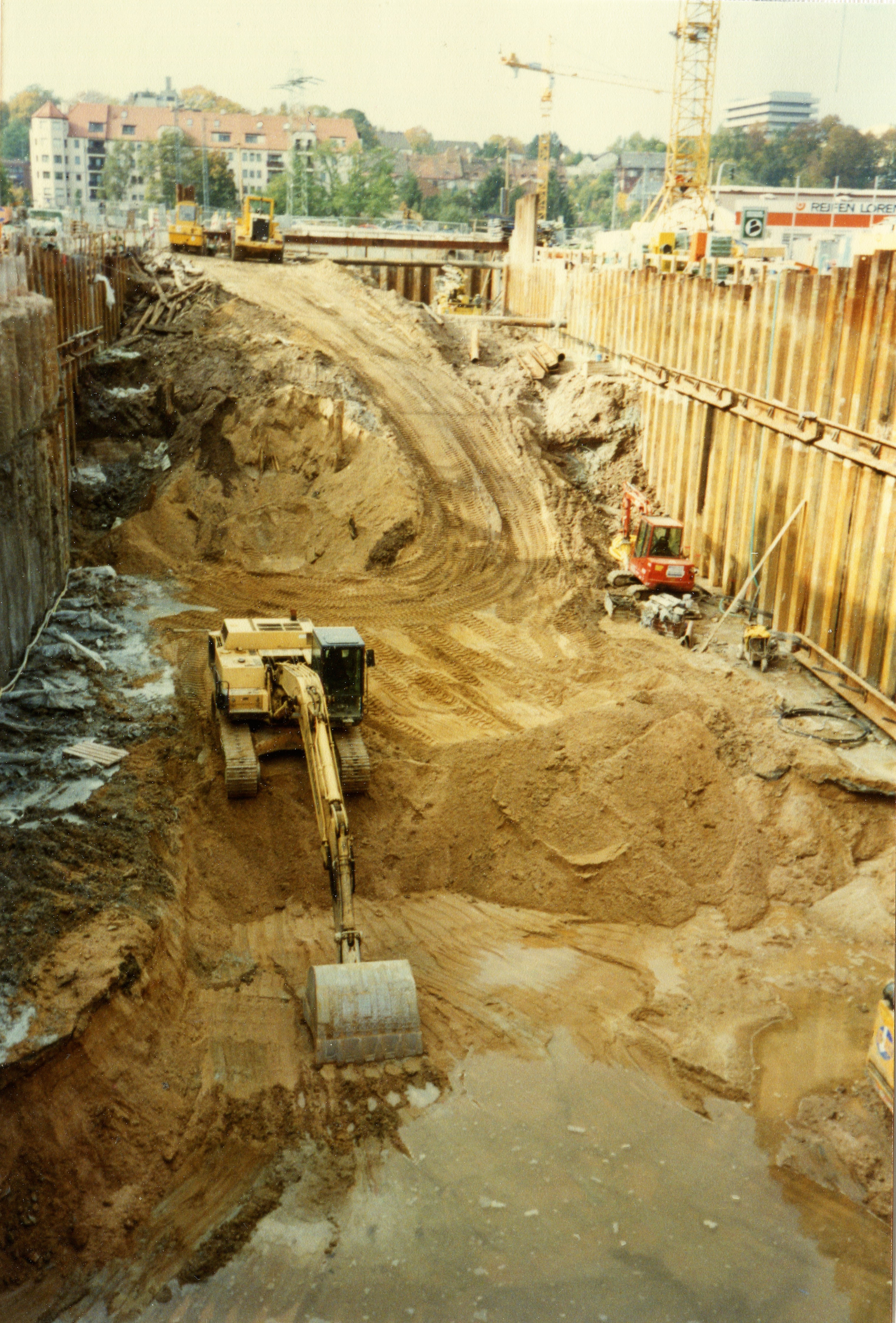 | Beschreibung | Tiefbauarbeiten für den U-Bahnhof Stadthalle Blickrichtung Billinganlage im Oktober 1996 | ||