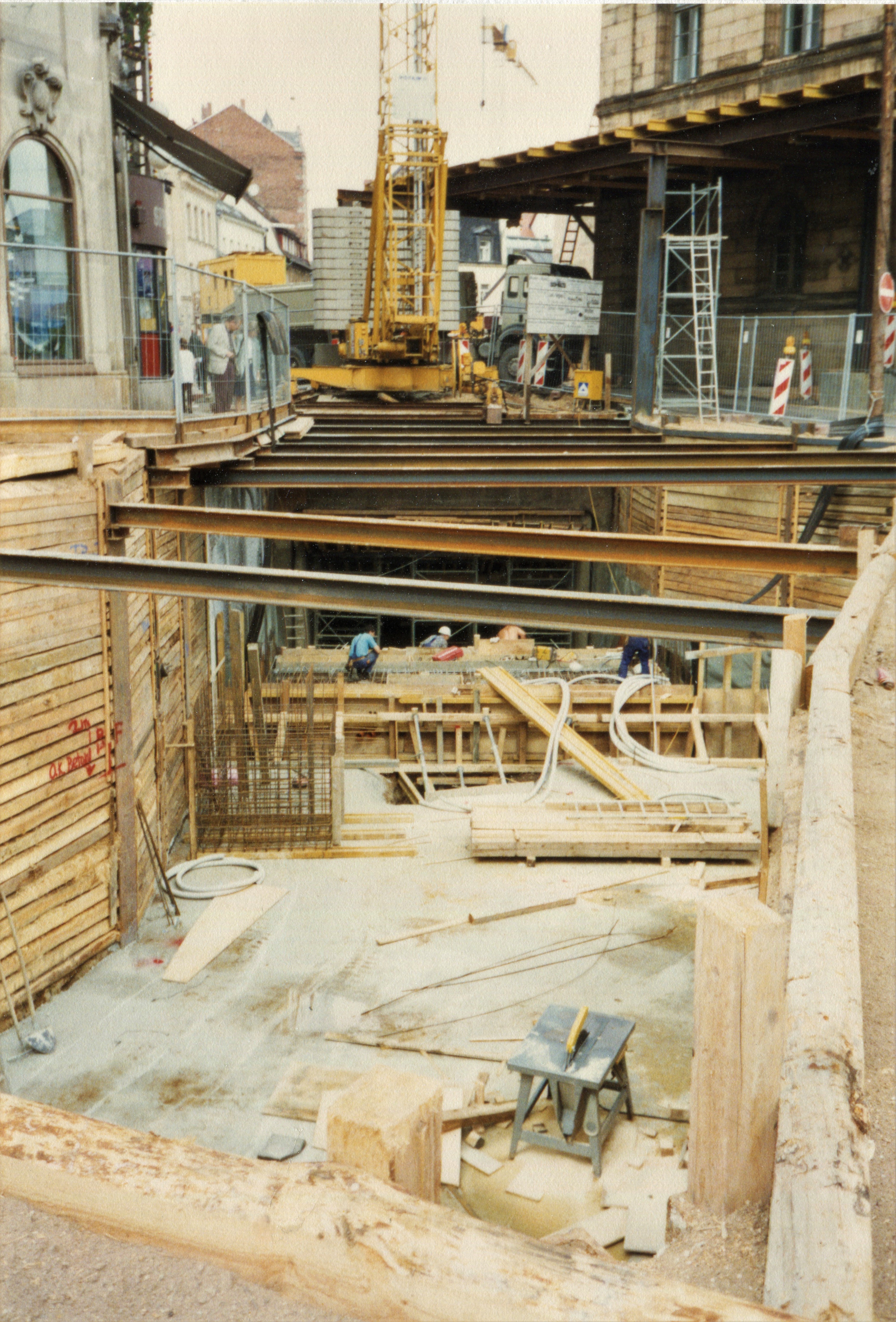 | Beschreibung | U-Bahn Tiefbauarbeiten am Kohlenmarkt Blickrichtung Ludwig-Erhard-Straße, rechts das Rathaus im August 1996 | ||