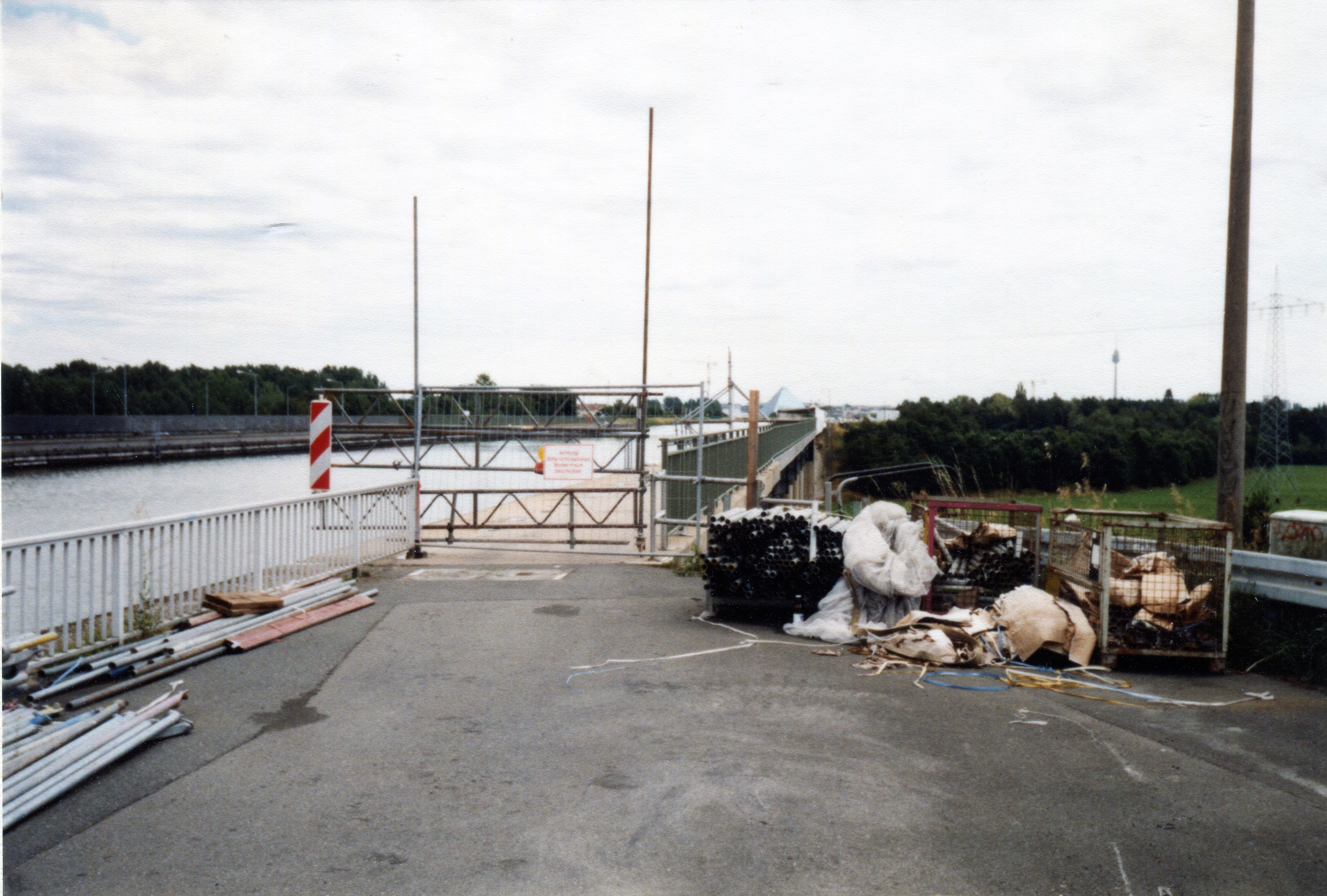 BeschreibungReparaturarbeiten an der Kanalbrücke Rednitz am Main-Donau-Kanal, im Hintergrund das Hotel-Pyramide im August 1999