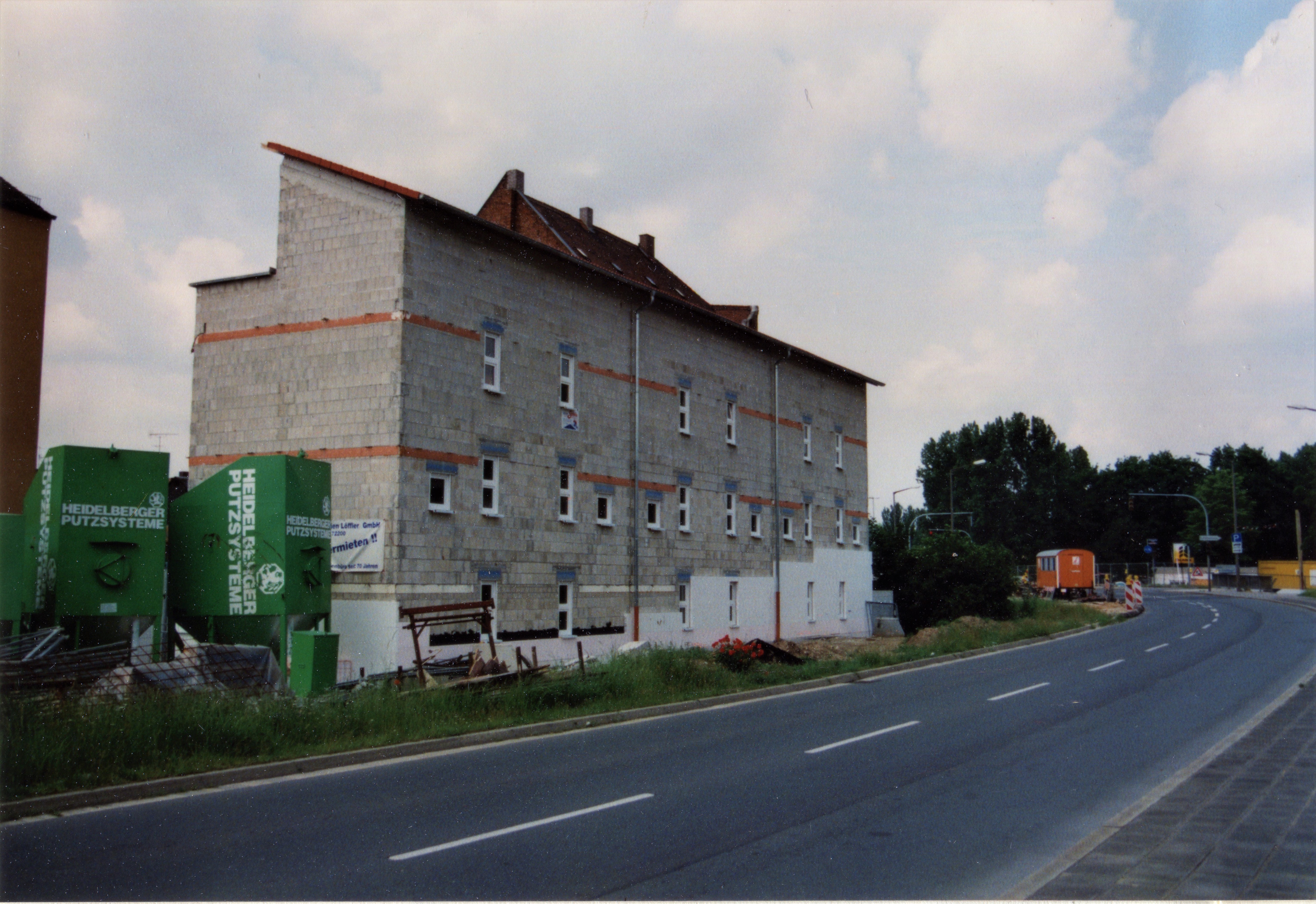 | Beschreibung | 2. Bauabschnitt der als Lärmschutzwall geplanten Reihenhäuser an der Nordspange Richtung Angerstraße als Fortsetzung des 1. BA Heiligenstraße 33-59 im Juni 1999 | ||