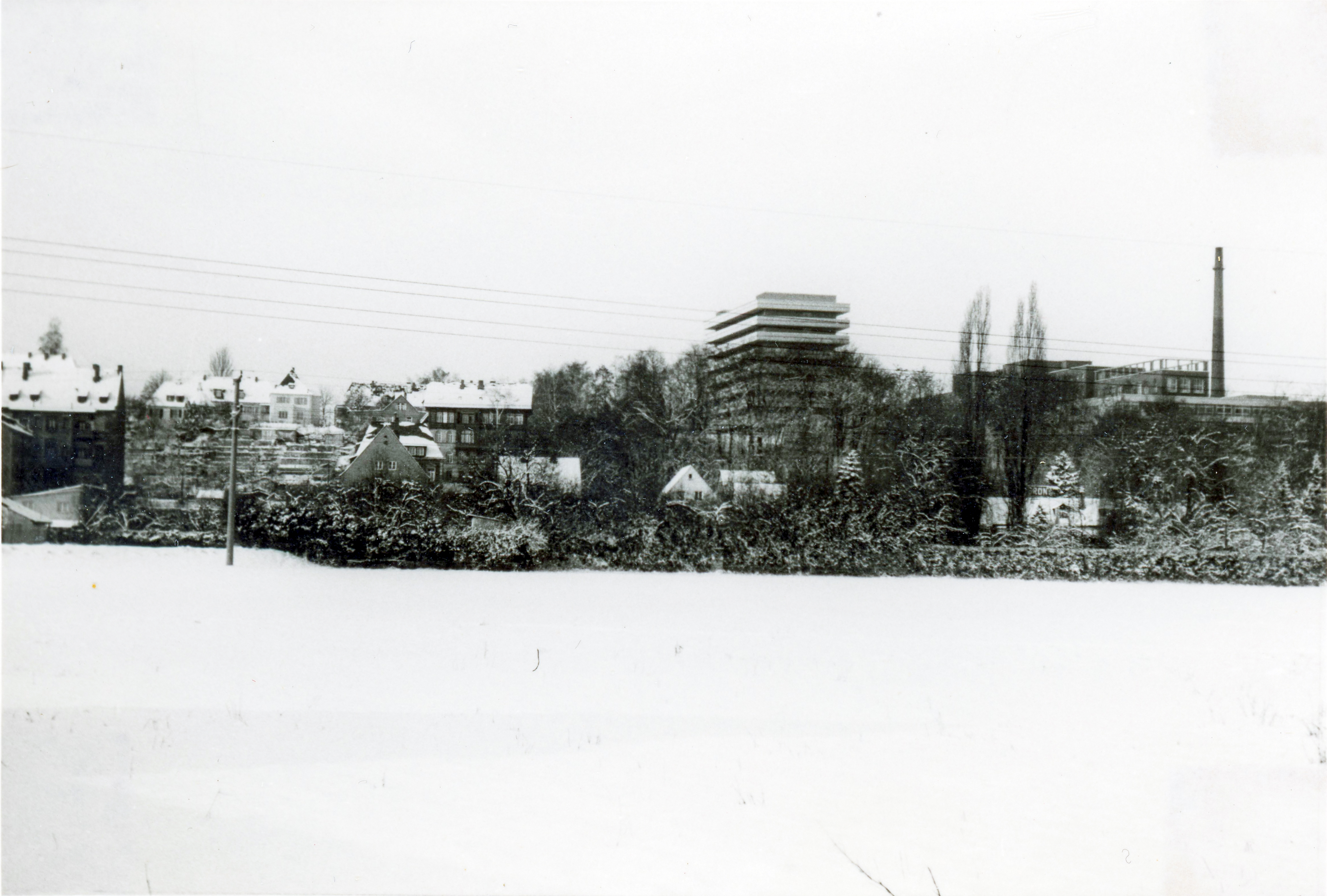 | Beschreibung | Blick über den Wiesengrund zur Vacher Straße, im Hintergrund die ehem. Kinderklinik, Dez. 1968 | ||