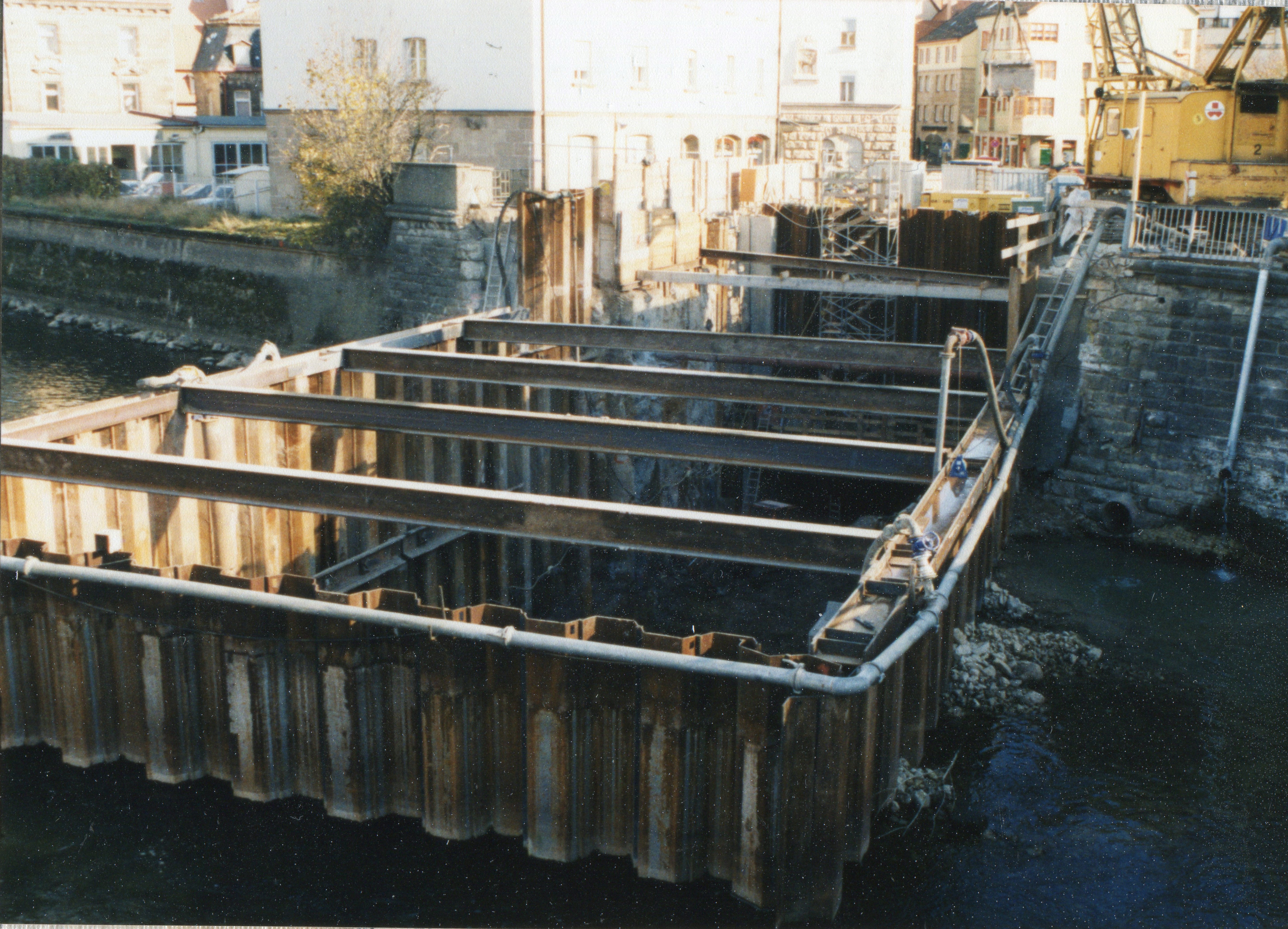 | Beschreibung | Spundwand Kasten in der Rednitz an der Maxbrücke. Vorbereitung zu den Tiefbauarbeiten zur Unterquerung des Flusses für die U-Bahn am 8. Dezember 1997. Gebäude links Königstraße 1. | ||