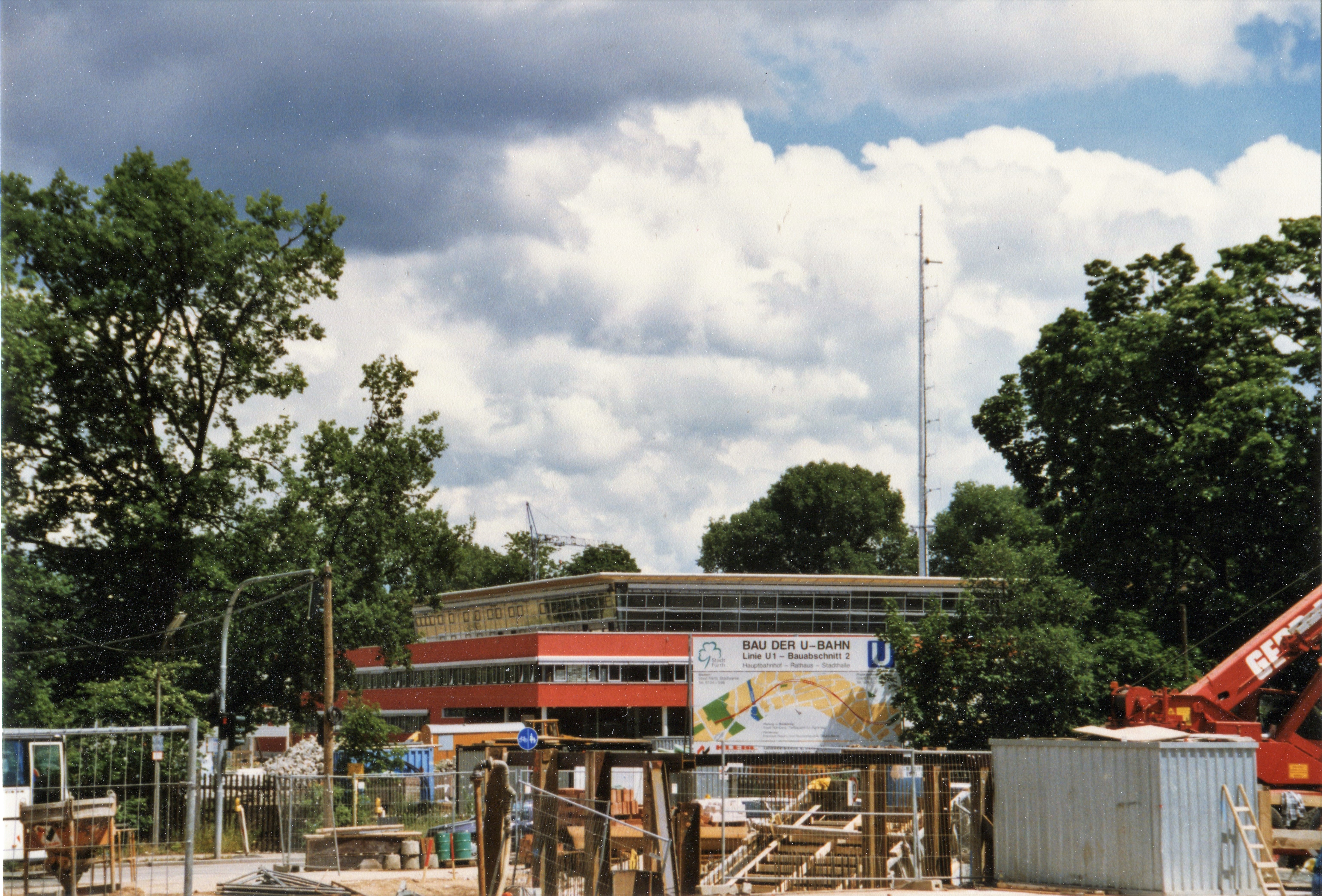 | Beschreibung | U-Bahn Bauarbeiten am U-Bahnhof Stadthalle mit Schautafel, im Hintergrund die neue Polizei Hauptwache im Juni 1997 | ||
