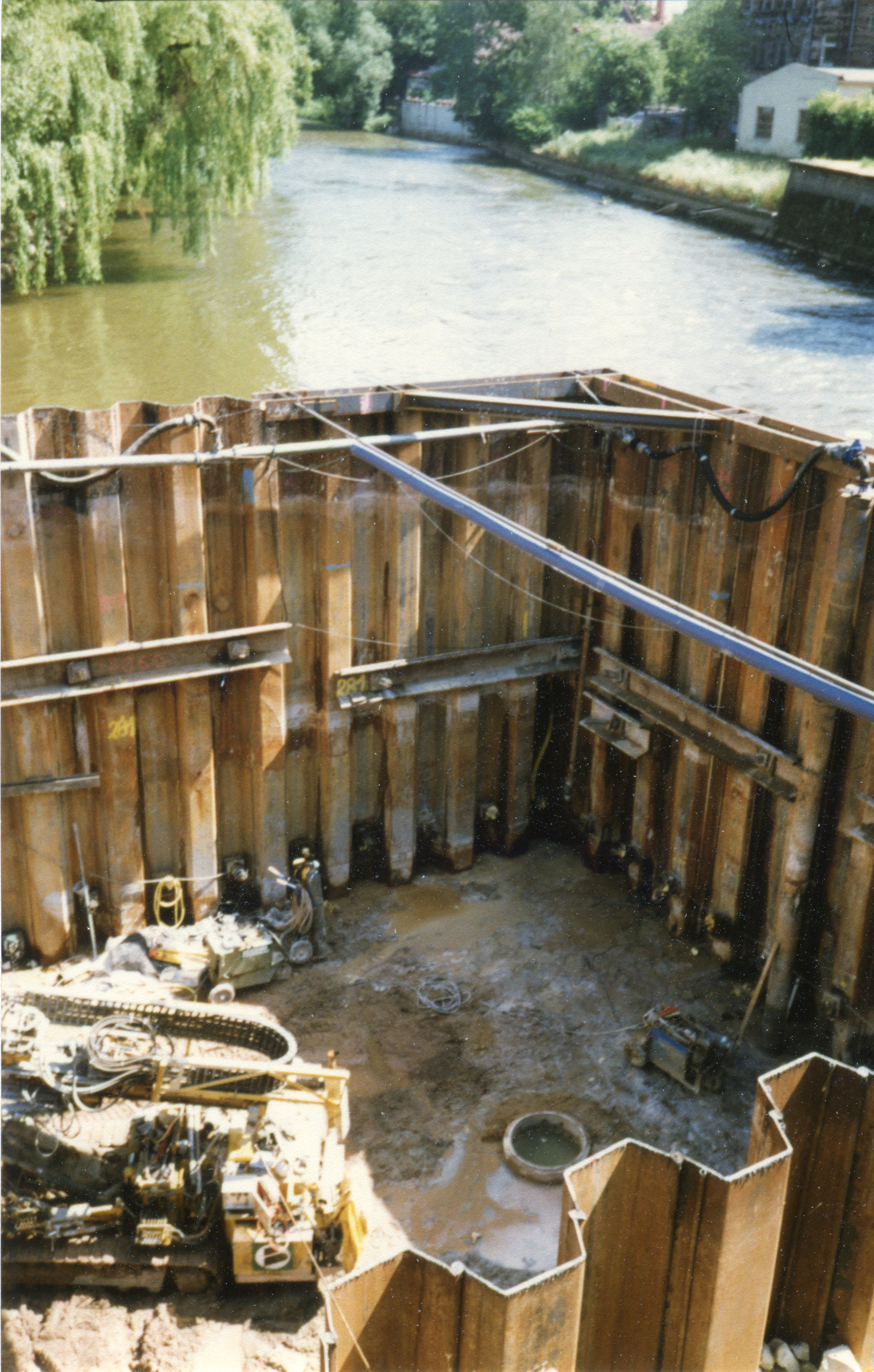 | Beschreibung | Spundwand Kasten in der Rednitz an der Maxbrücke. Vorbereitung zu den Tiefbauarbeiten zur Unterquerung des Flusses für die U-Bahn im Juni 1997 | ||