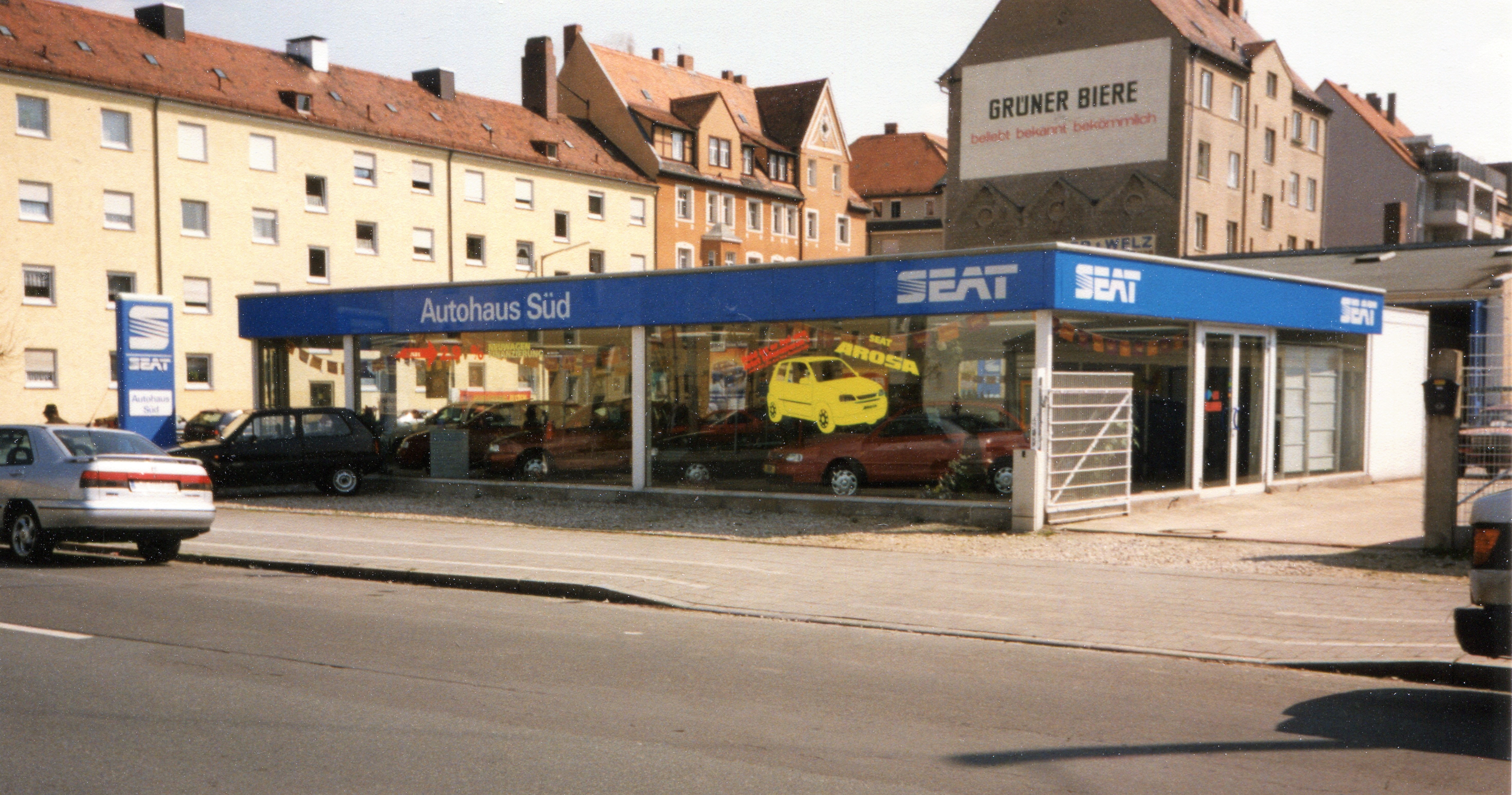 | Beschreibung | Autohaus Süd Herrnstraße 26, an gleicher Stelle wurde das Autohaus Graf nach dem Krieg gegründet. Schöne Fassadenwerbung am Gebäude Herrnstraße 68 der Brauerei Grüner und im Hintergrund Häuserzeile Ludwigstraße 65-67-69-71, im März 1997 | ||