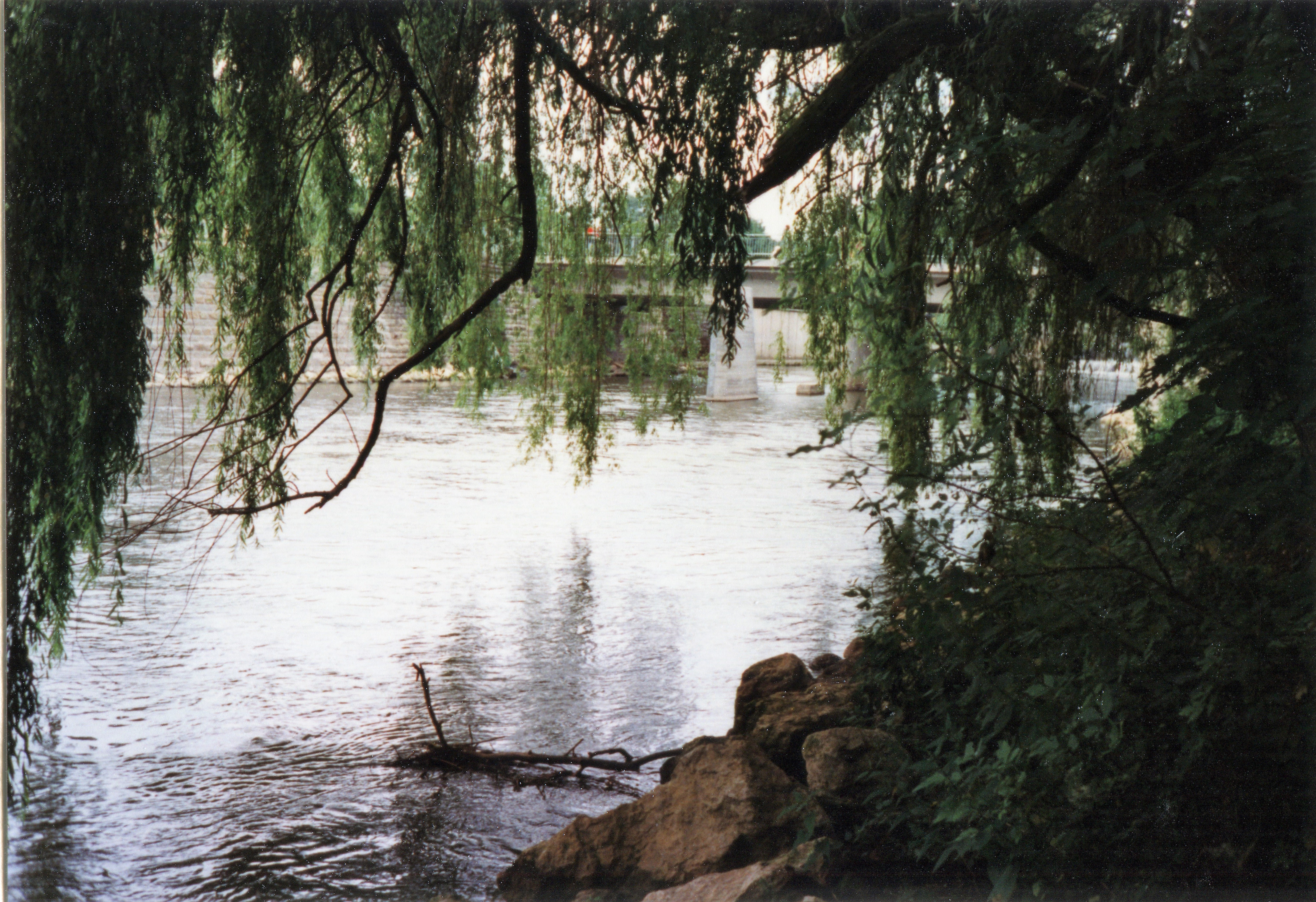 | Beschreibung | Blick vom Restaurant Außenbereich "Ufergarten" im ehem. Alter Schlachthof über Rednitz zur Maxbrücke im Juli 1998 | ||