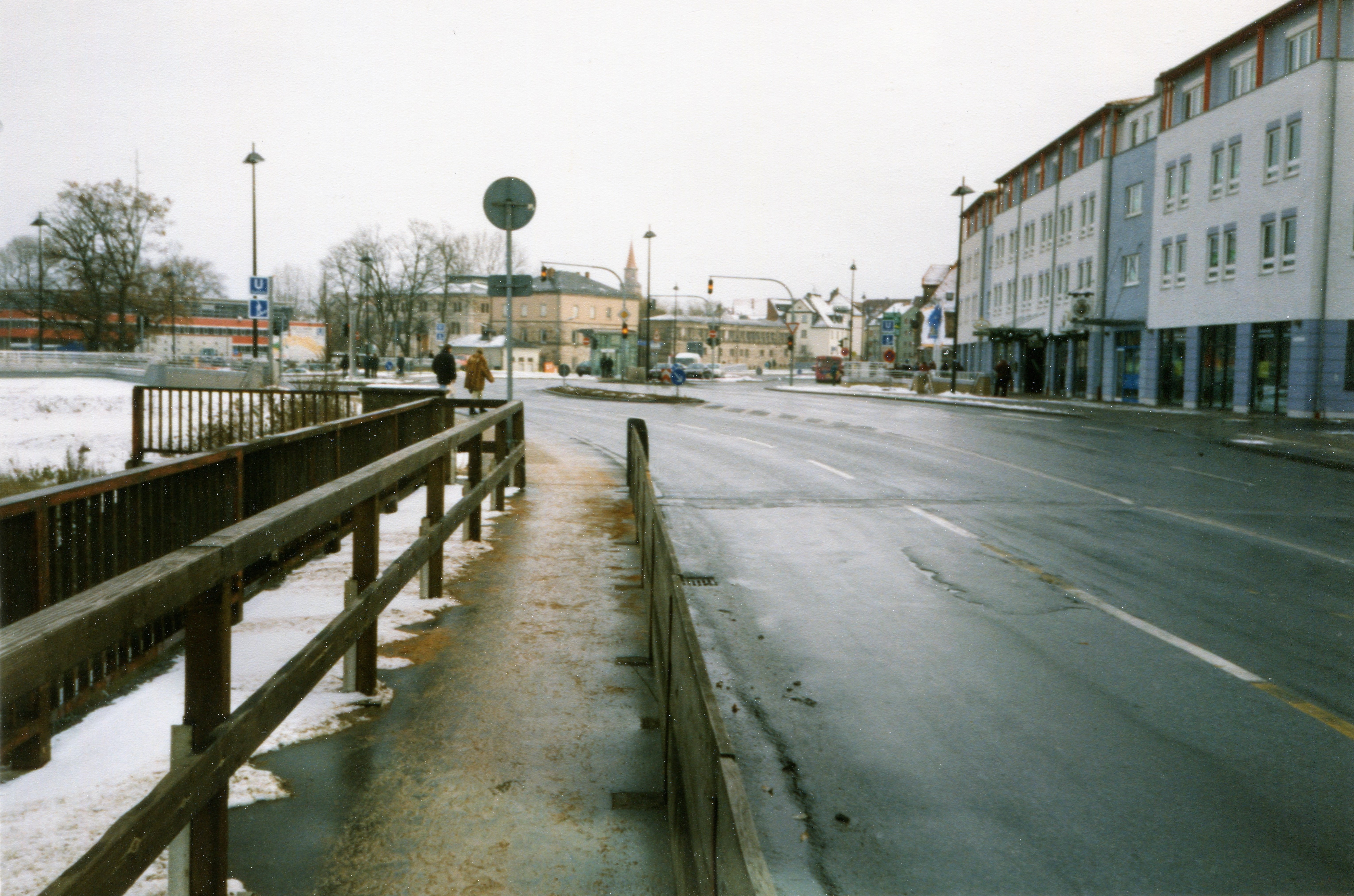 | Beschreibung | Blickrichtung von der Flutbrücke zum Kulturforum mit neuen Zugang zum U-Bahnhof Stadthalle. Rechts Hotel am Forum, heute Max aparthotel im November 1998 | ||
