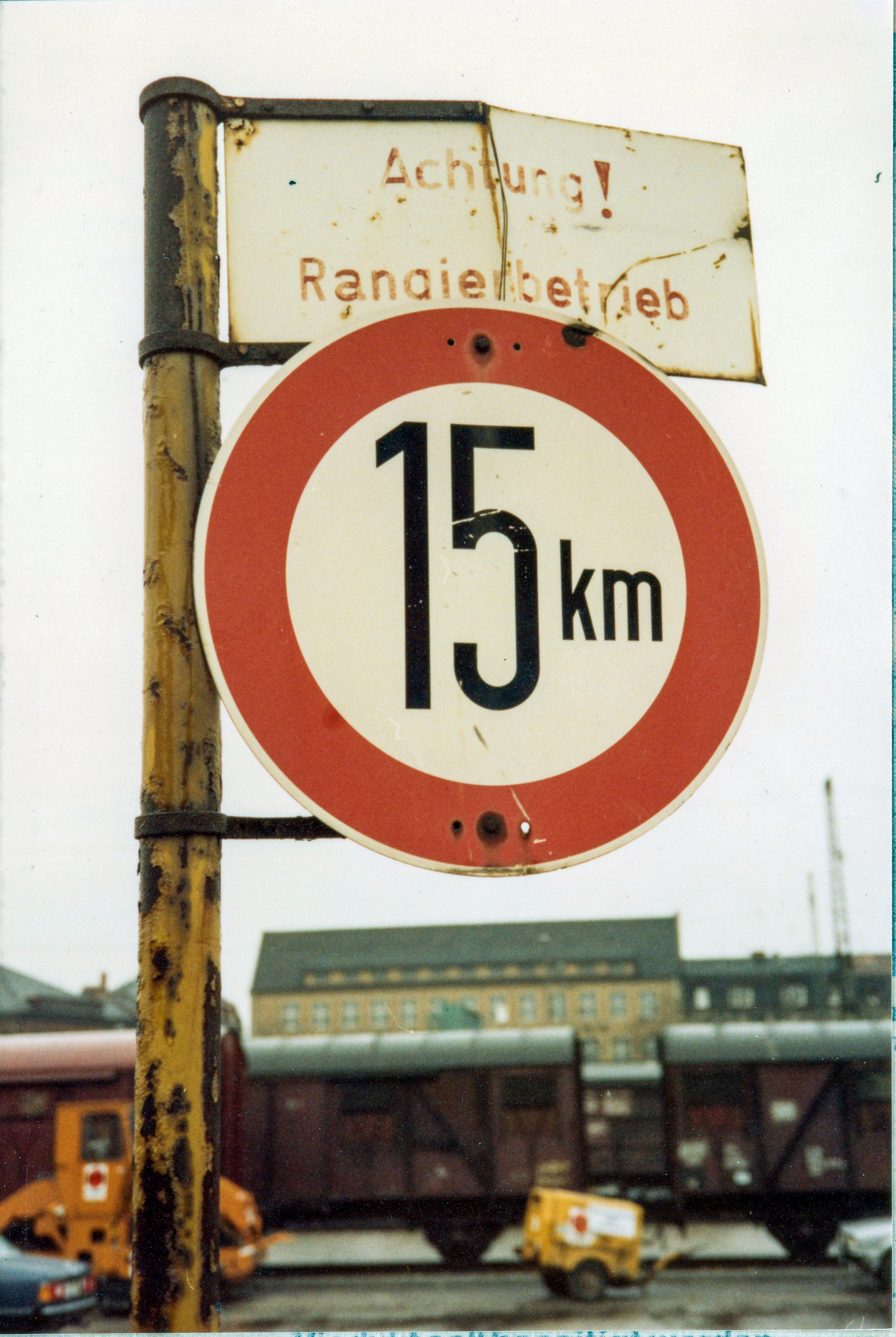 | Dateiinfo (Bild-Unterschrift und Info-Box, automatisch erstellt) | Alte Beschilderung am ehem. Rangierbahnhof in der Gebhardtstraße, 1982 Lizenz: CC BY-SA 4.0 | ||