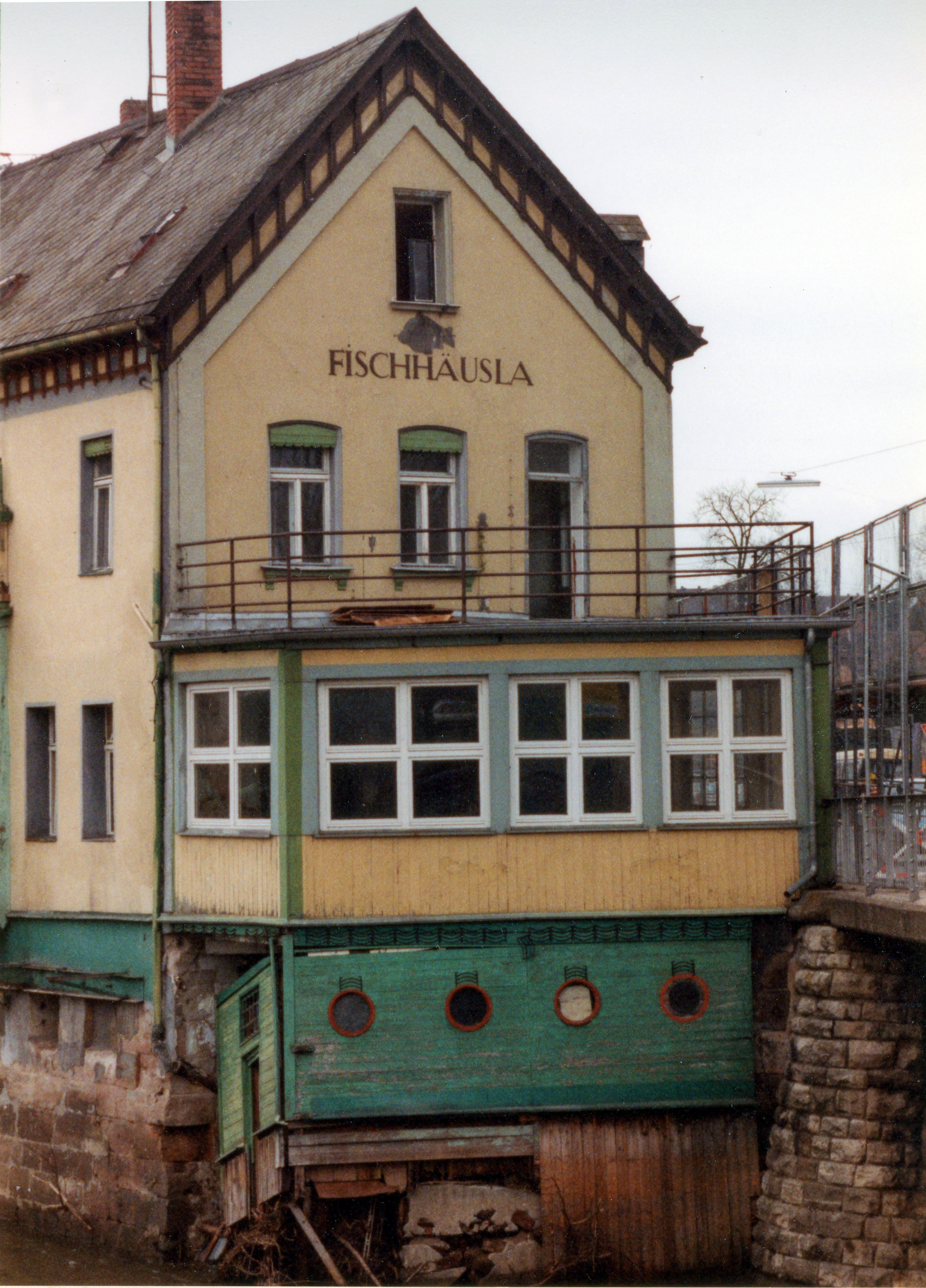 | Dateiinfo (Bild-Unterschrift und Info-Box, automatisch erstellt) | Abrissarbeiten an der ehem. Gaststätte Fischhäusla, Nov. 1994 Urheber: Klaus-Peter Schaack<br><br>Lizenz: CC BY-SA 4.0 | ||