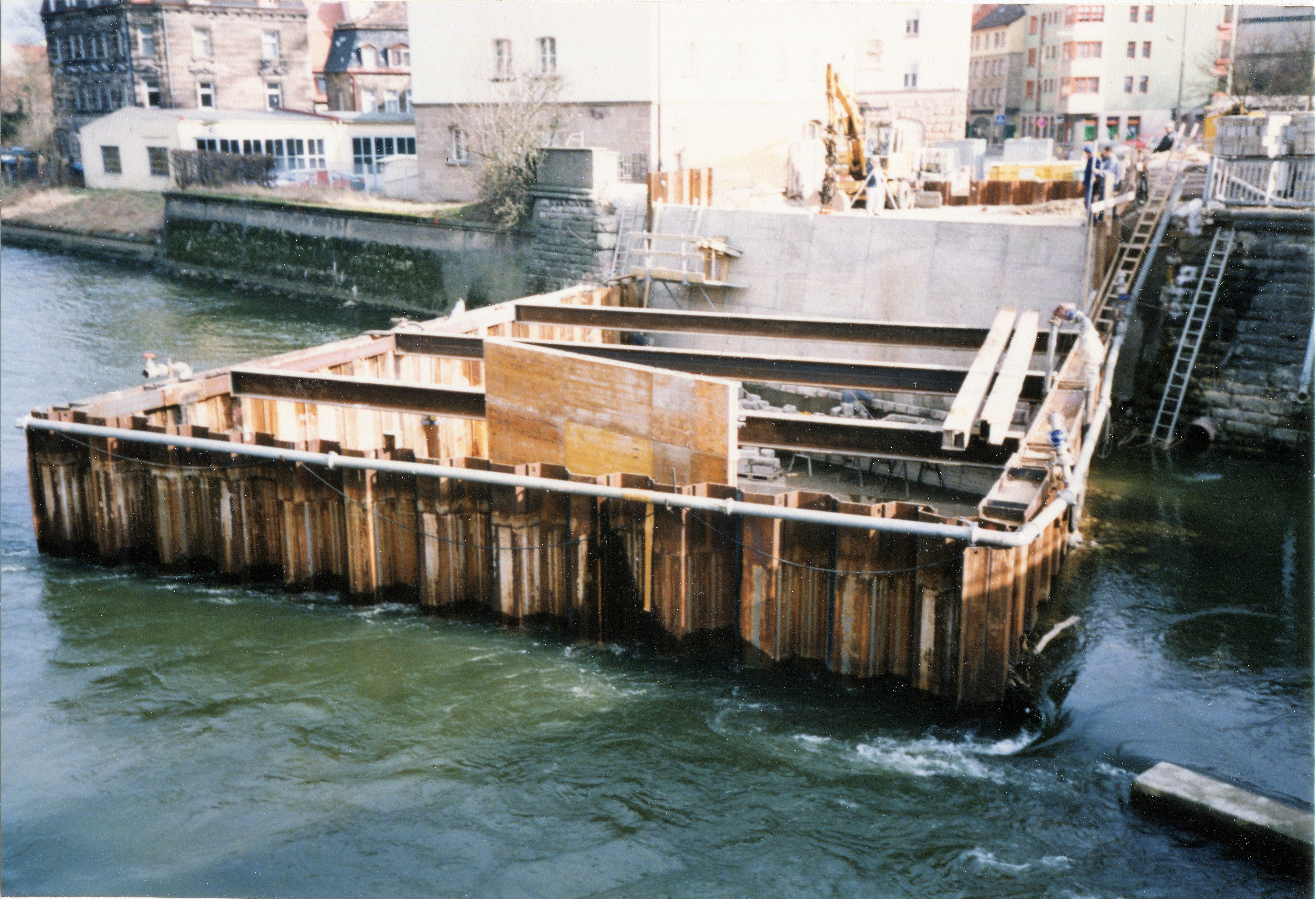 | Beschreibung | Abbau Spundwand Kasten in der Rednitz an der Maxbrücke nach U-Bahn Baumaßnahme. Neue betonierten Uferböschung die später mit Verblendsteinen versehen wird, im Februar 1998 | ||