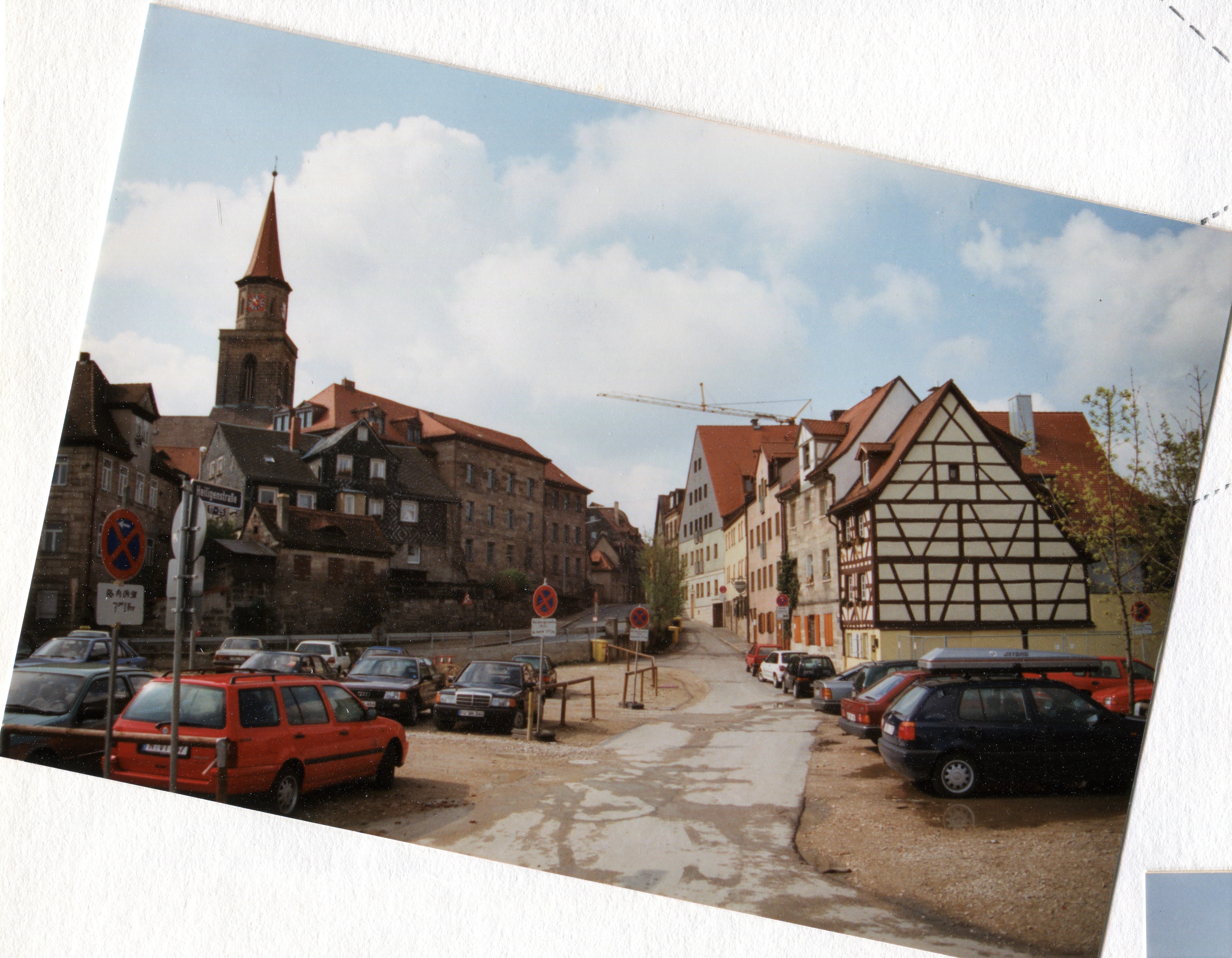 | Beschreibung | Blick auf den Heiligenberg und die Heiligenstraße mit Kirche St. Michael, Schrödershof und Schulgebäude Kirchenplatz 2, 2a im April 1998 | ||