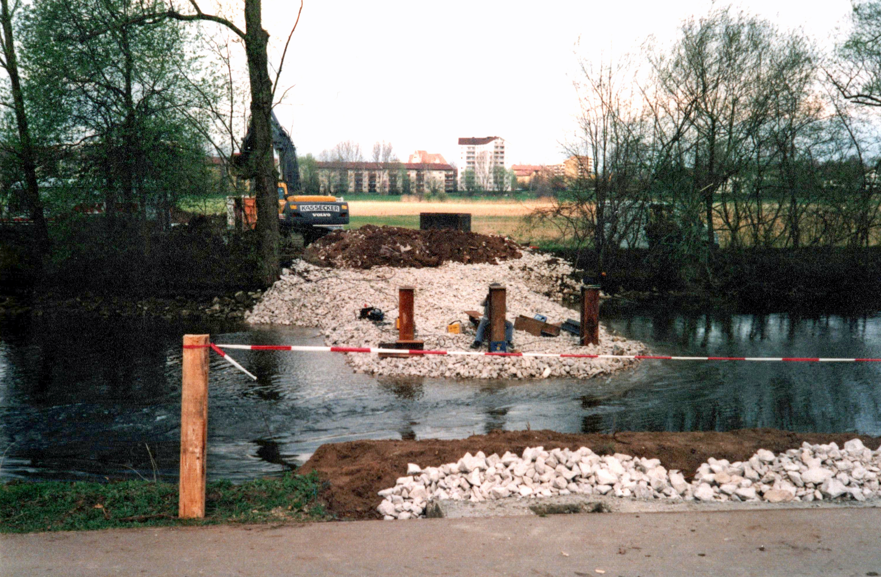 | Beschreibung | Bau einer Behelfsbrücke über die Pegnitz im Rahmen der Baumaßnahme Regenüberlaufbecken im Stadtpark, April 2000 | ||