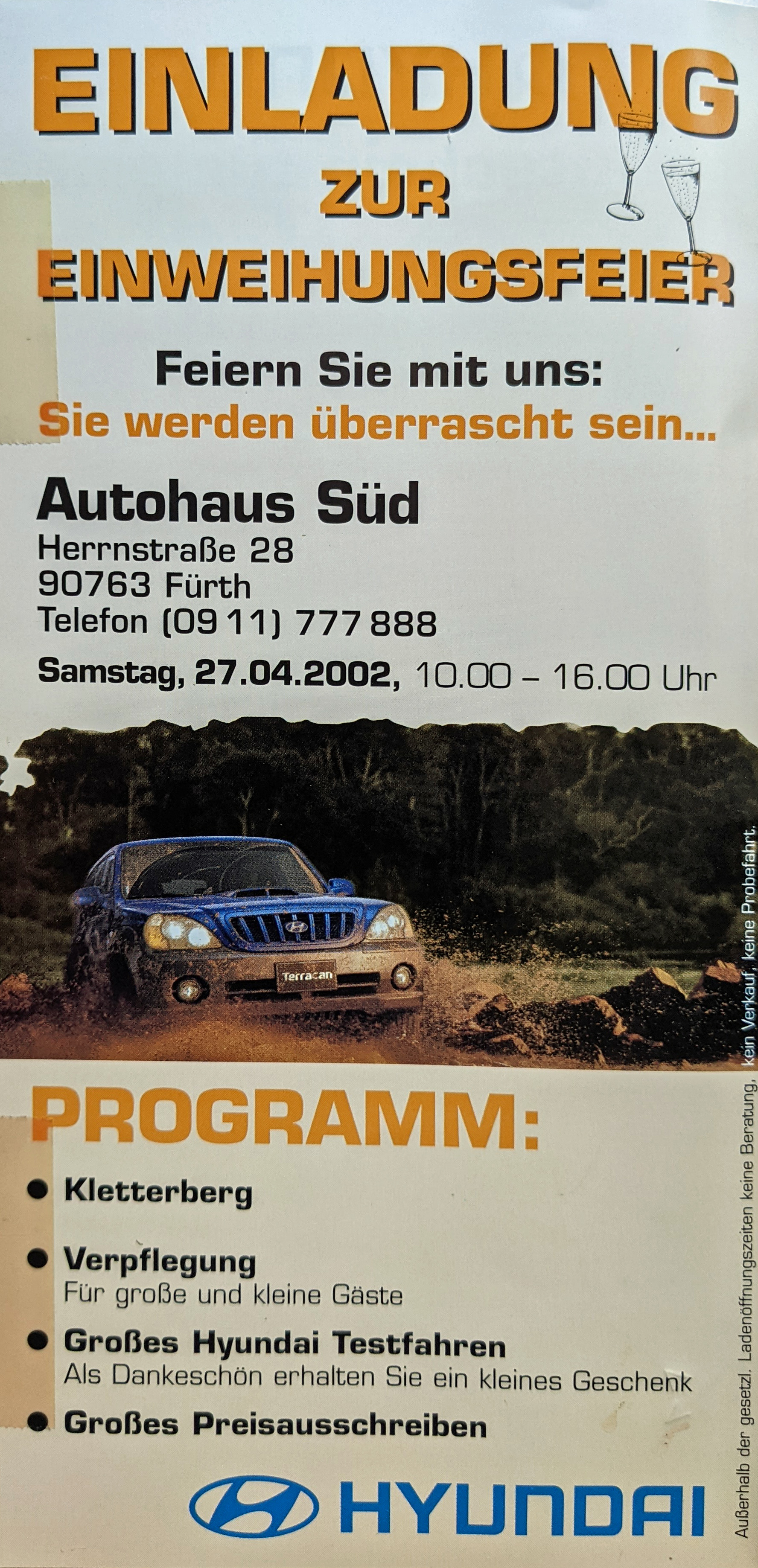 | Dateiinfo (Bild-Unterschrift und Info-Box, automatisch erstellt) | Flyer zur Eröffnung des Autohauses Süd in der Herrnstraße, April 2002 Urheber: Klaus-Peter Schaack<br><br>Lizenz: CC BY-SA 3.0 | ||