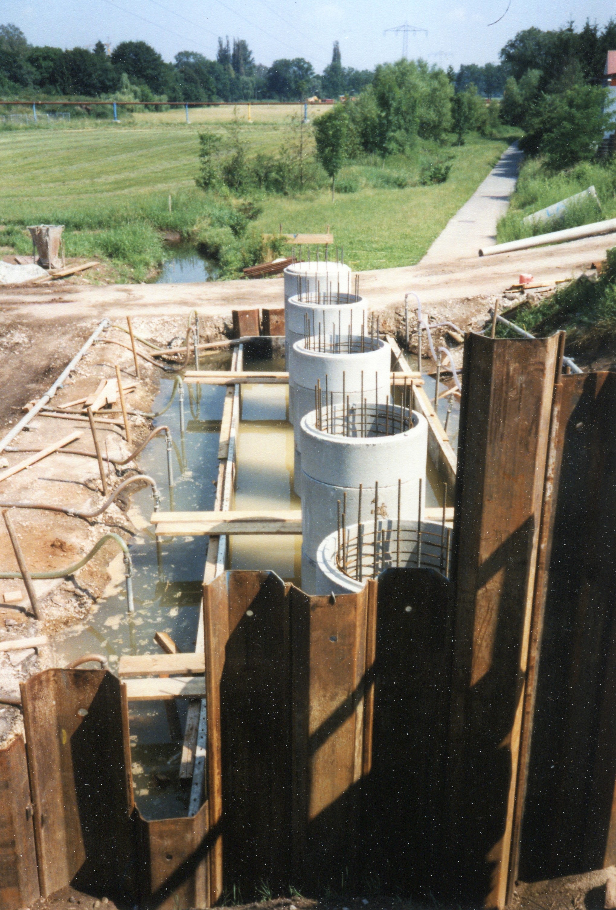 | Beschreibung | Bau der Fundamente für die Behelfsbrücke im Wiesengrund neben der Flutbrücke, deren Abriss im August erfolgte, Blickrichtung Norden mit Scherbsgraben (Gewässer) im Mai 2003 | ||