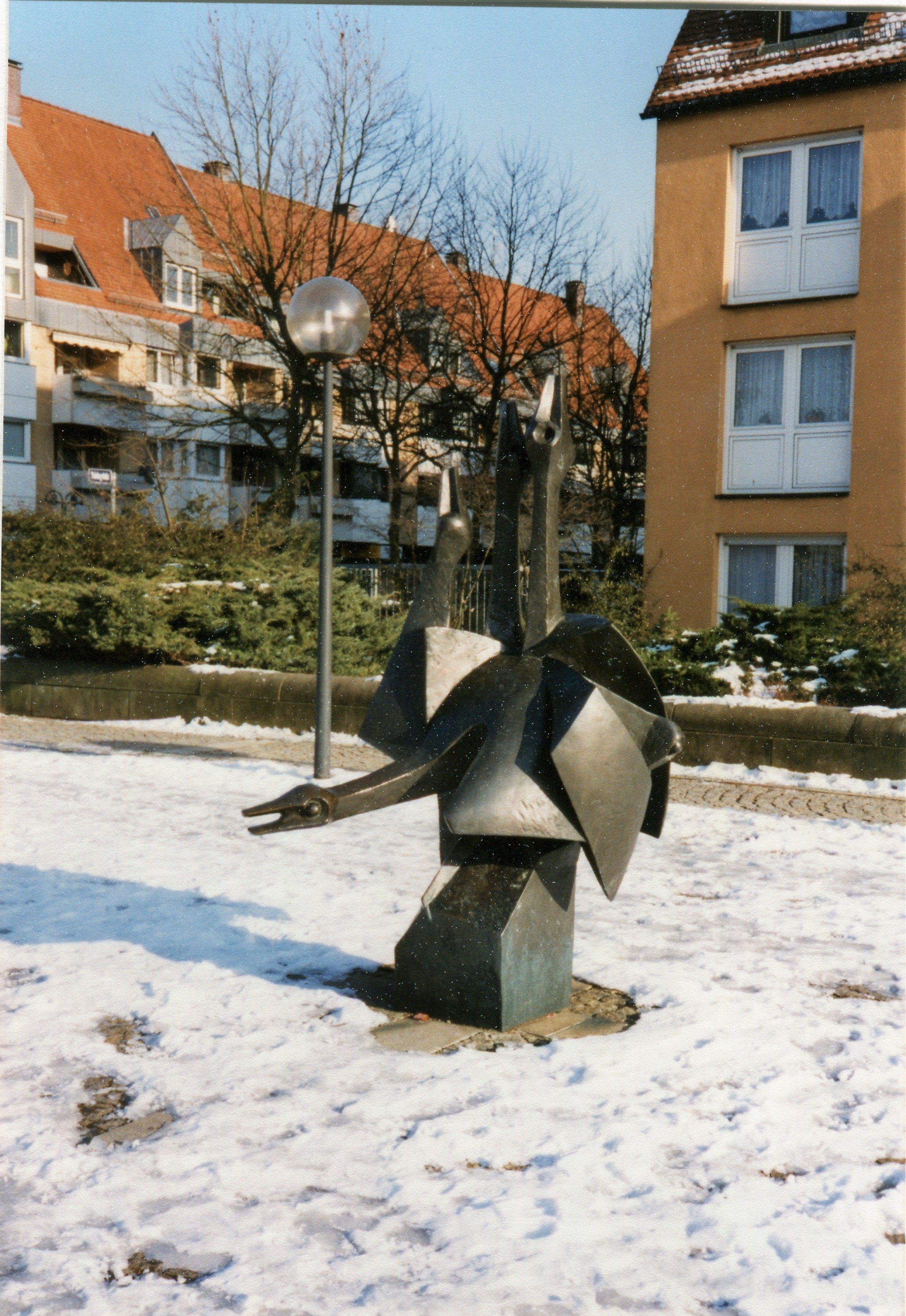 | Beschreibung | Bronzeplastik "Gänse" von Heinz Heiber am Paisleyplatz (ehemals), Feb. 2003 | ||