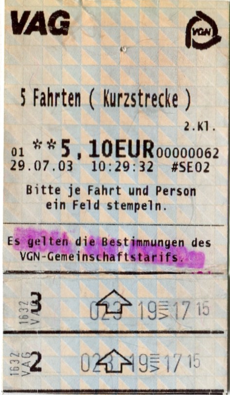 | Dateiinfo (Bild-Unterschrift und Info-Box, automatisch erstellt) | VGN Fahrschein Kurzstrecke U-Bahn Juli 2003 Urheber: VGN<br><br>Lizenz: CC BY-SA 3.0 | ||