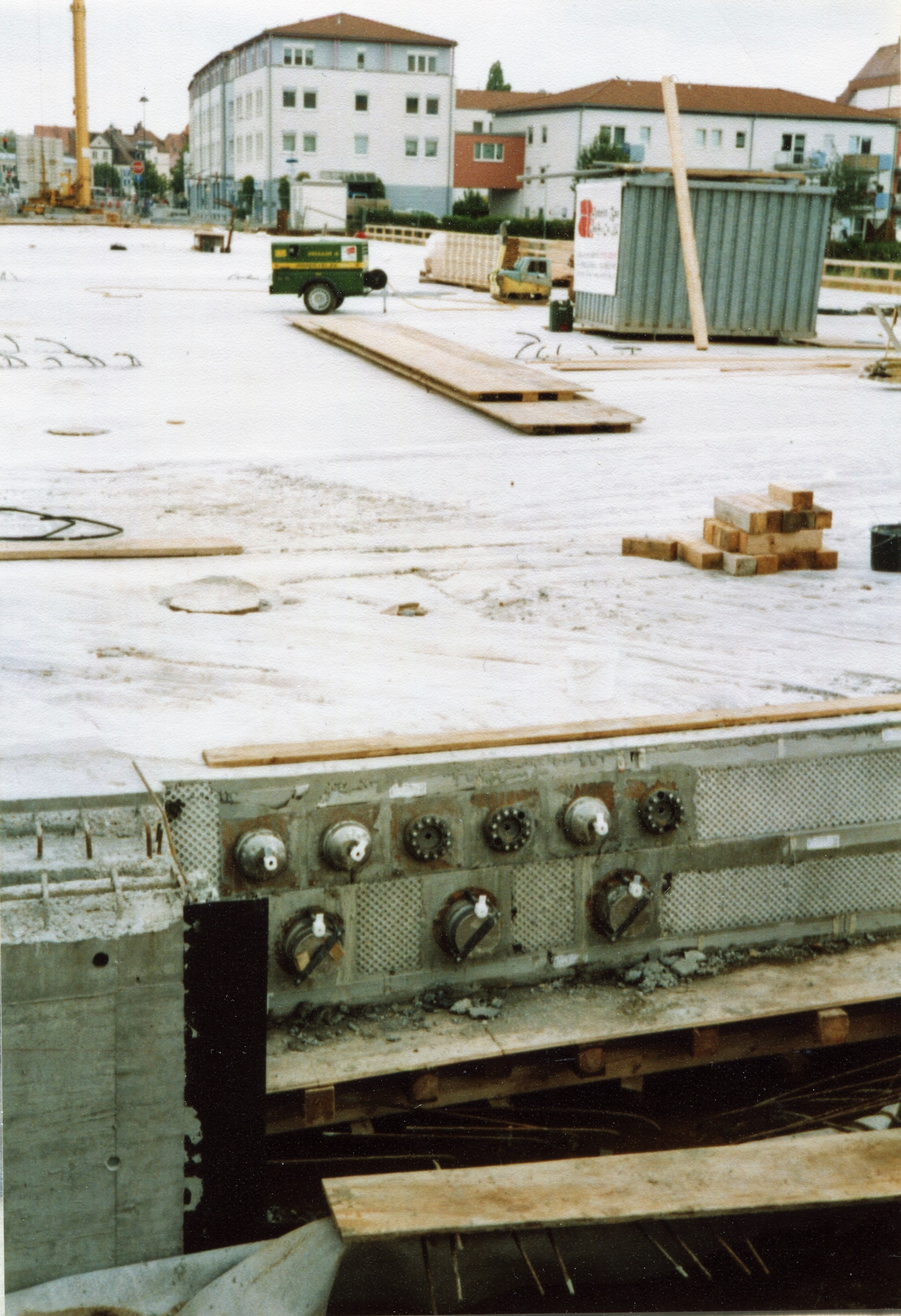 | Beschreibung | Neubau und neue Fahrbahn der Flutbrücke, die hier sichtbaren 6 Spannstahl Bündel sind mit Anker gesichert, während auf der anderen Seite der Spannbetonbrücke sie noch ungespannt aus den Leerrohren heraushängen (s. vorheriges Foto) am 05. Juli 2004 | ||