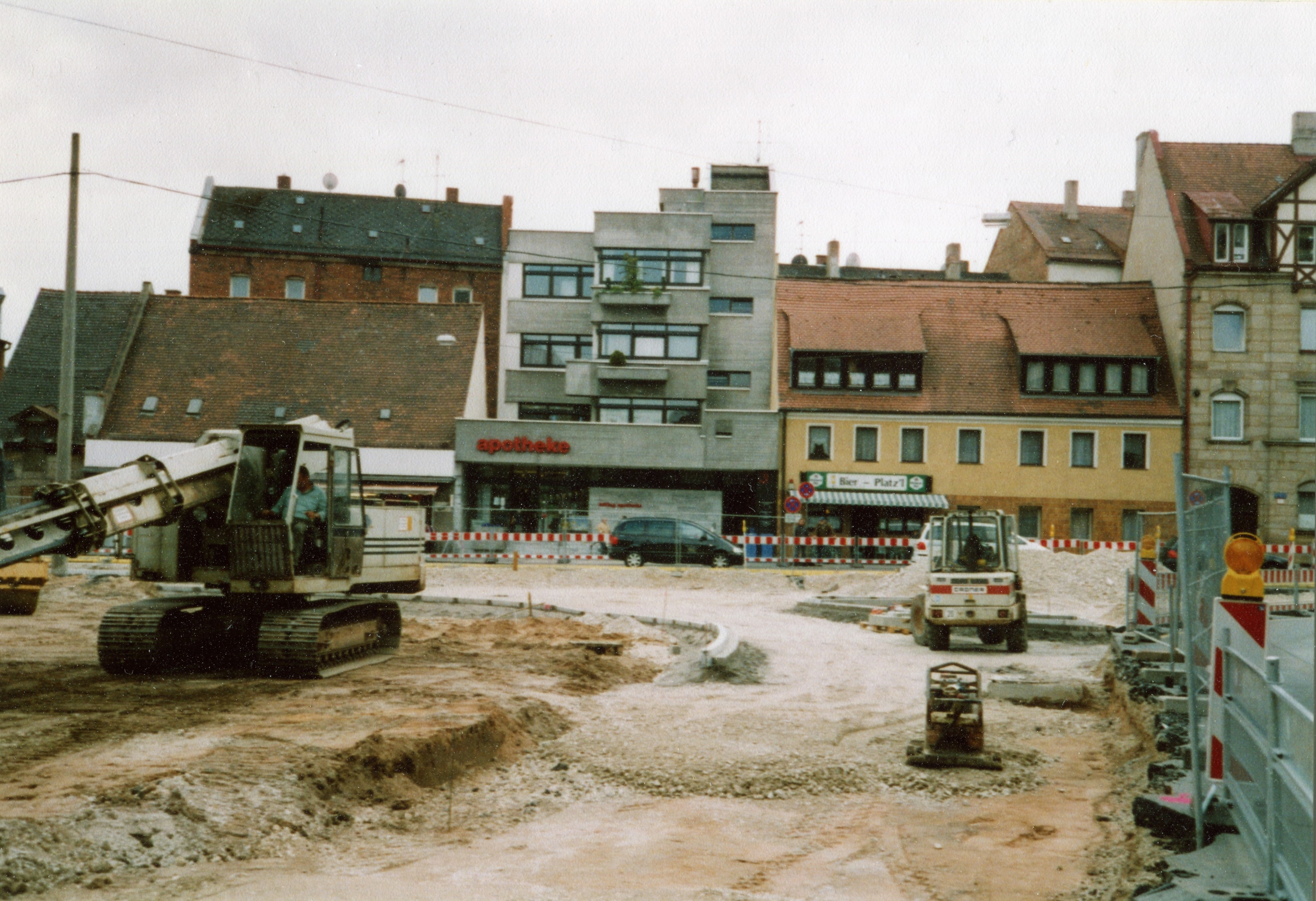 | Beschreibung | Blick von der Vacher Straße in die im Umbau befindliche Billinganlage Richtung Hochstraße. Mitte Apotheke Würzburger Straße 40 im Juli 2004 | ||
