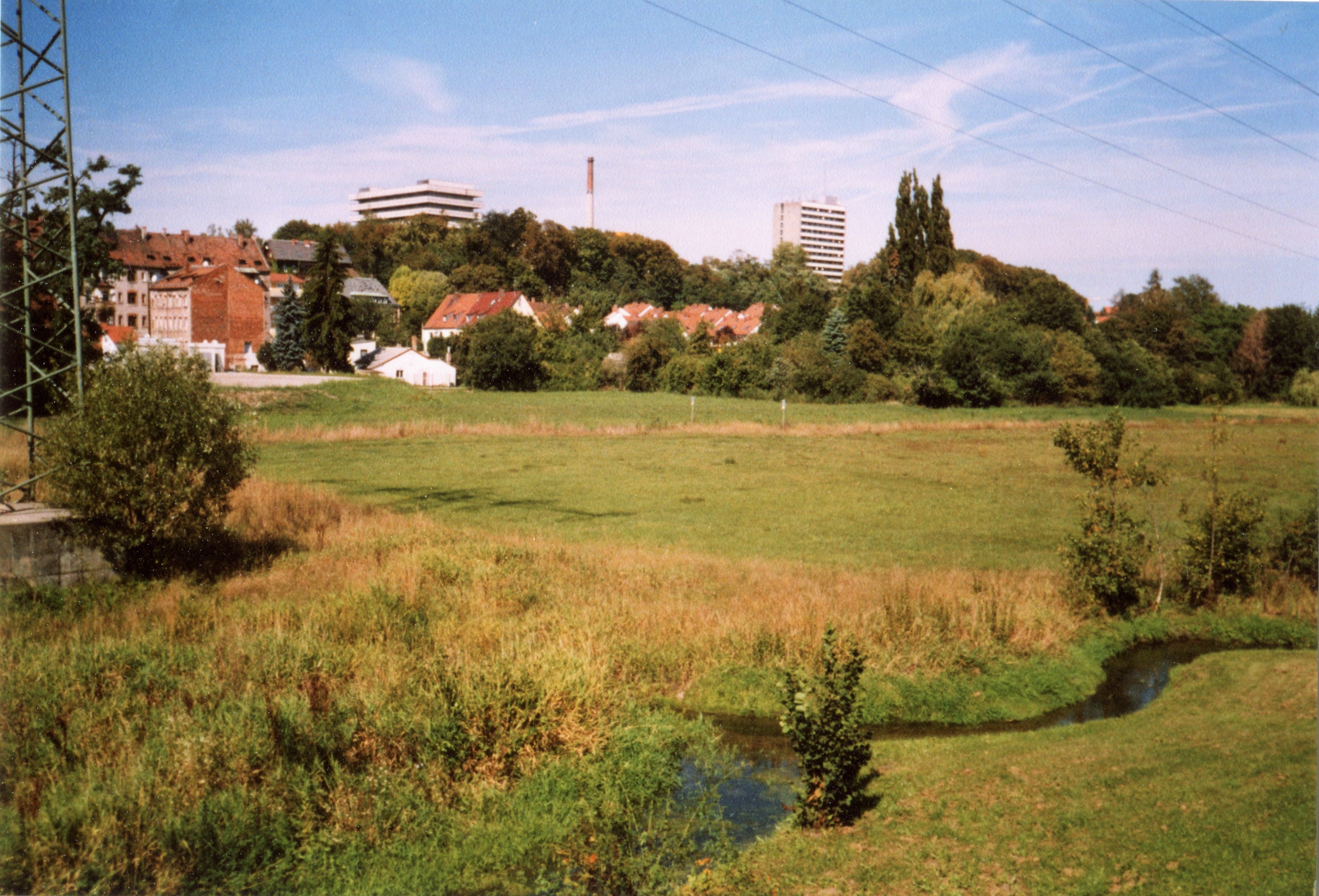 | Dateiinfo (Bild-Unterschrift und Info-Box, automatisch erstellt) | Blick vom Wiesengrund mit renaturierten Scherbsgraben Richtung Vacher Straße und Klinikum Fürth mit ... Blick vom Wiesengrund mit renaturierten Scherbsgraben Richtung Vacher Straße und Klinikum Fürth mit der ehem. Kinderklinik (Hochhaus links). Aufnahme vom September 2004. Siehe Foto mit gleichen Motiv von 1984.<br>Urheber: Klaus-Peter Schaack<br><br>Lizenz: CC BY-SA 3.0 | ||