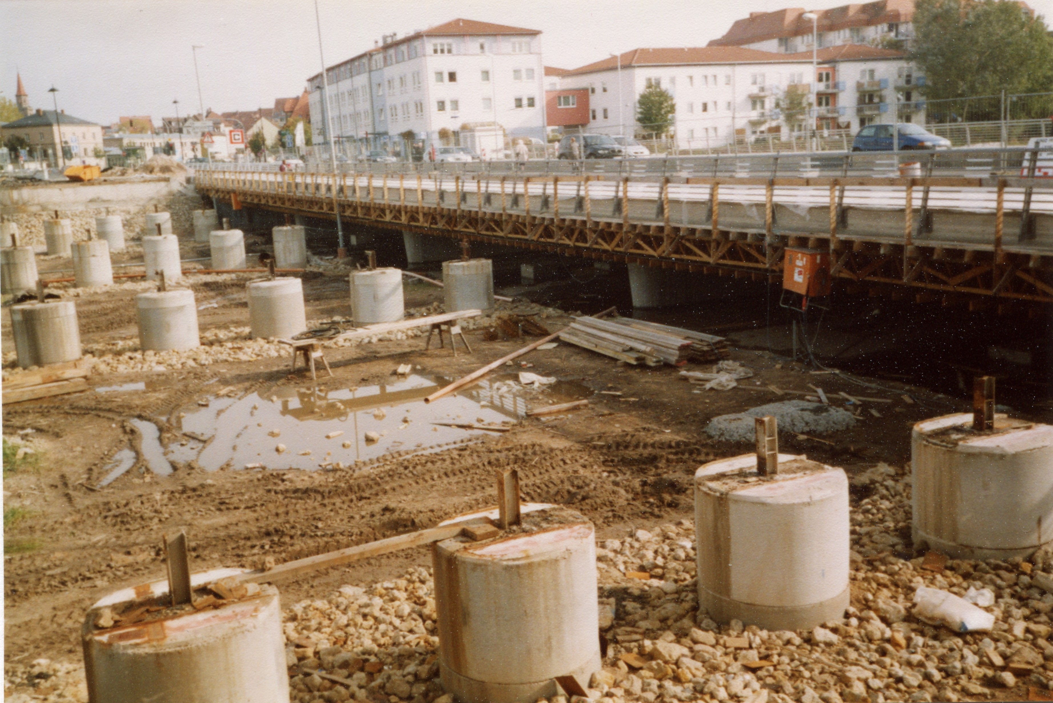 | Dateiinfo (Bild-Unterschrift und Info-Box, automatisch erstellt) | Die Behelfsbrücke ist abgebaut, nur die Fundamente sind noch da; daneben die neue Flutbrücke ... Die Behelfsbrücke ist abgebaut, nur die Fundamente sind noch da; daneben die neue Flutbrücke (Oktober 2004) – Hintergrund: links Kulturforum, rechts Hotel am Forum und Kursana<br>Urheber: Klaus-Peter Schaack<br><br>Lizenz: CC BY-SA 3.0 | ||