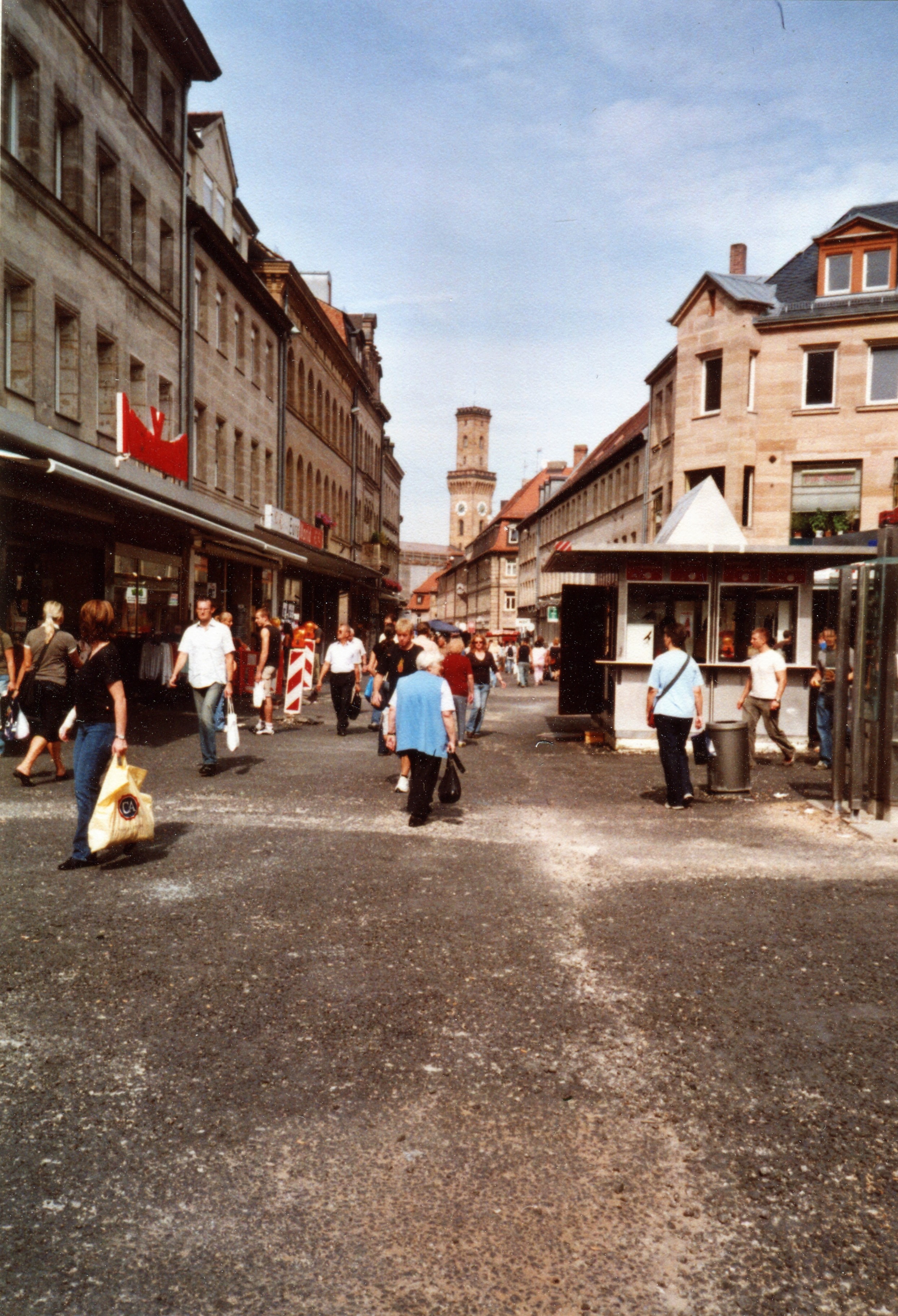 | Beschreibung | Blick in die Fußgängerzone mit Bratwurstbude vor der Einmündung Moststraße. Abgefräster Bodenbelag, die Steinlieferung aus China hat Lieferschwierigkeiten, im September 2006 | ||