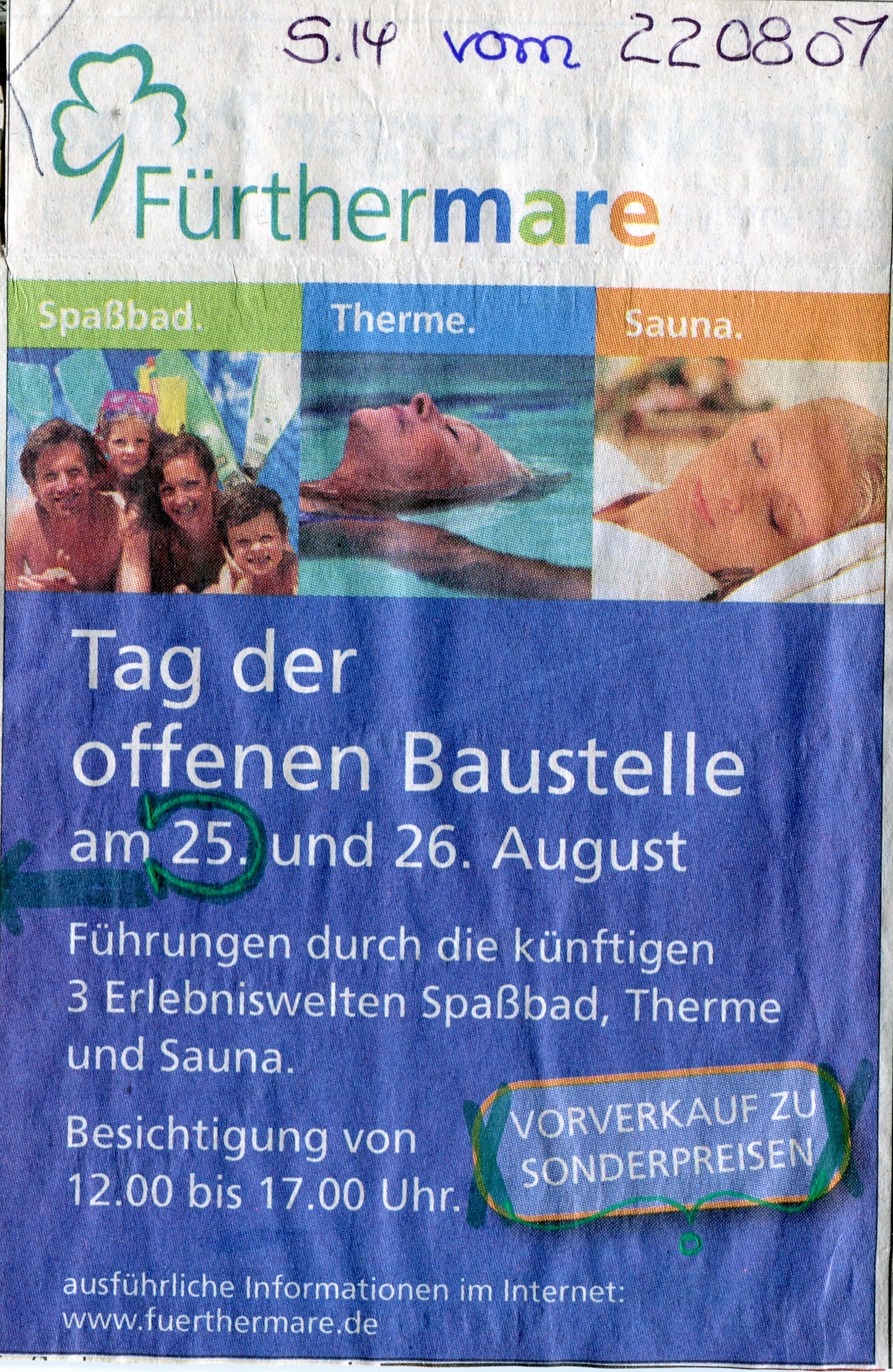 | Beschreibung | Inserat FN zum "Tag der offenen Baustelle "Fürthermare" am 25.+26.8.2007 | ||