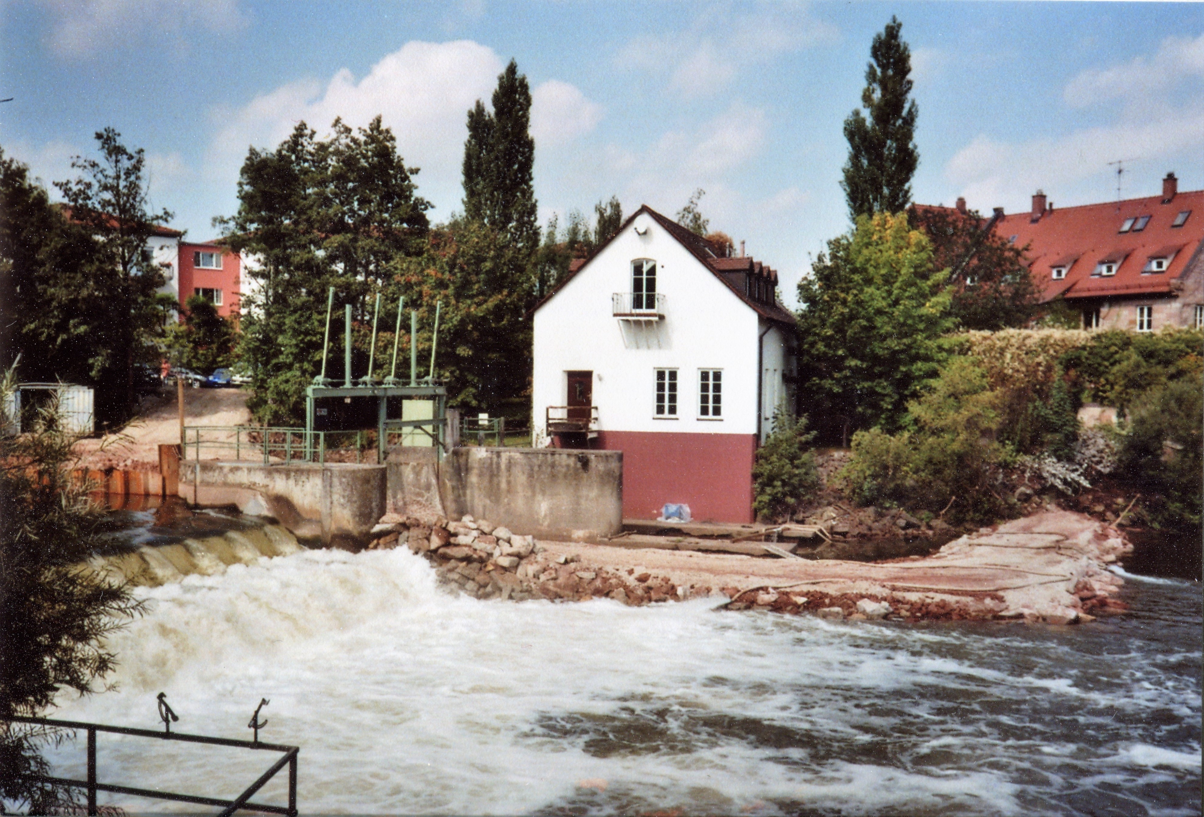 | Beschreibung | Bauarbeiten an der Stau- und Triebwerksanlage mit Maschinenhaus als letztes Bauteil der Foerstermühle, links die Kursana Residenz, rechts Gebäude Würzburger Straße 3 im September 2007 | ||
