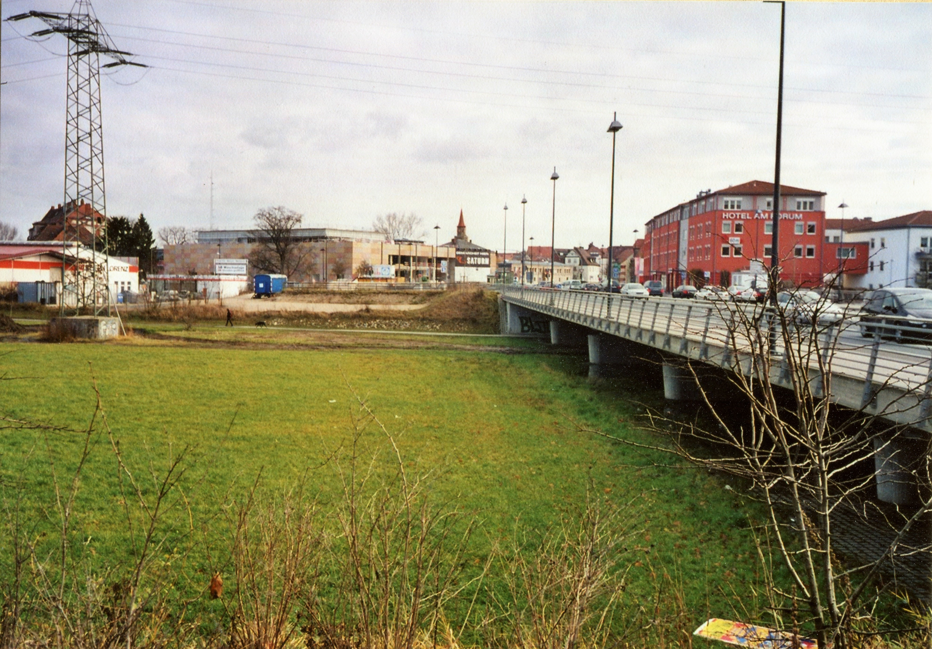 | Beschreibung | Blickrichtung zur Flutbrücke mit Hotel am Forum rechts und Mitte im Bau befindlicher Saturn Elektromarkt im November 2007 | ||