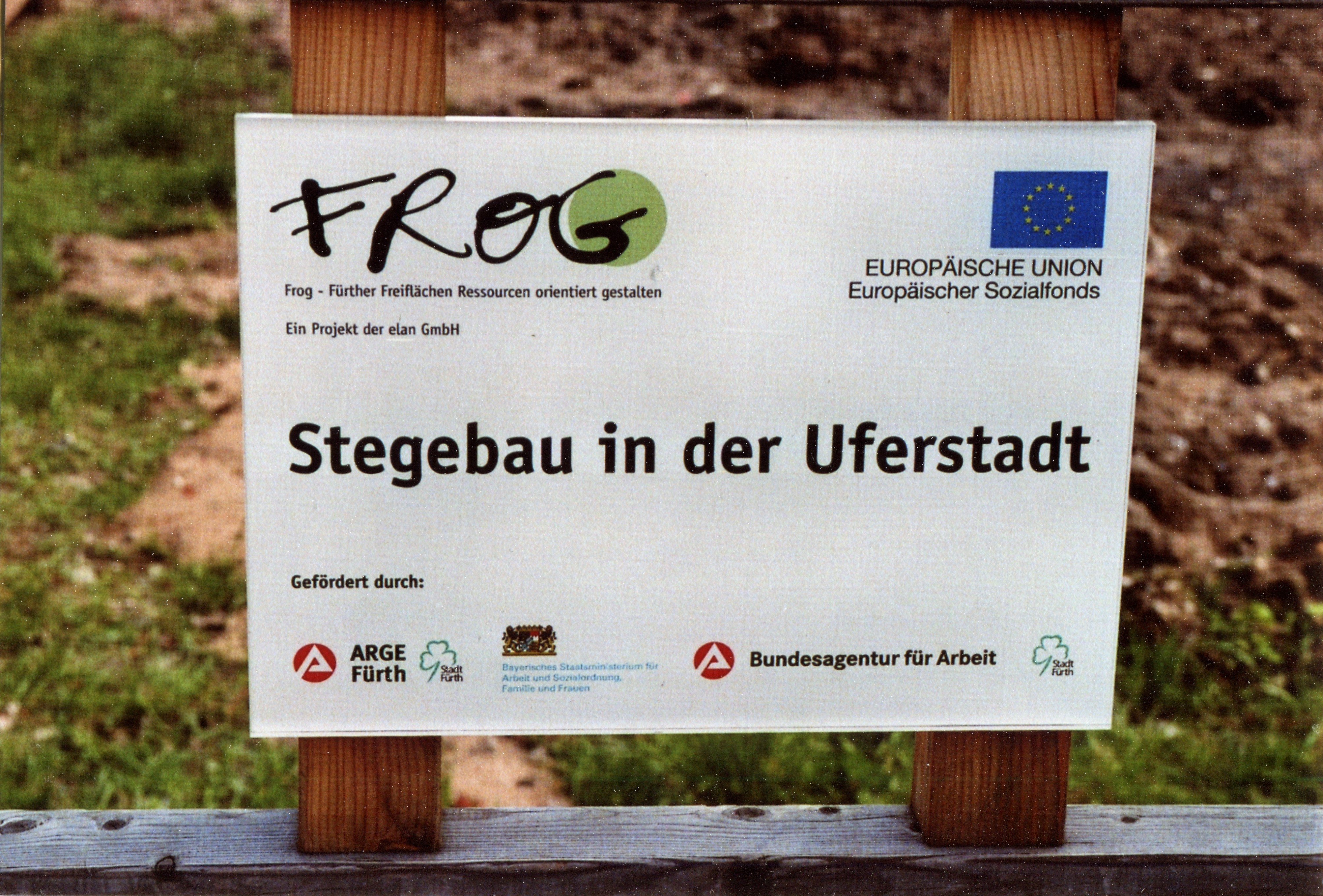 | Beschreibung | Schild mit Erklärung zum FROG-Steg an der Uferstadt im April 2008 | ||