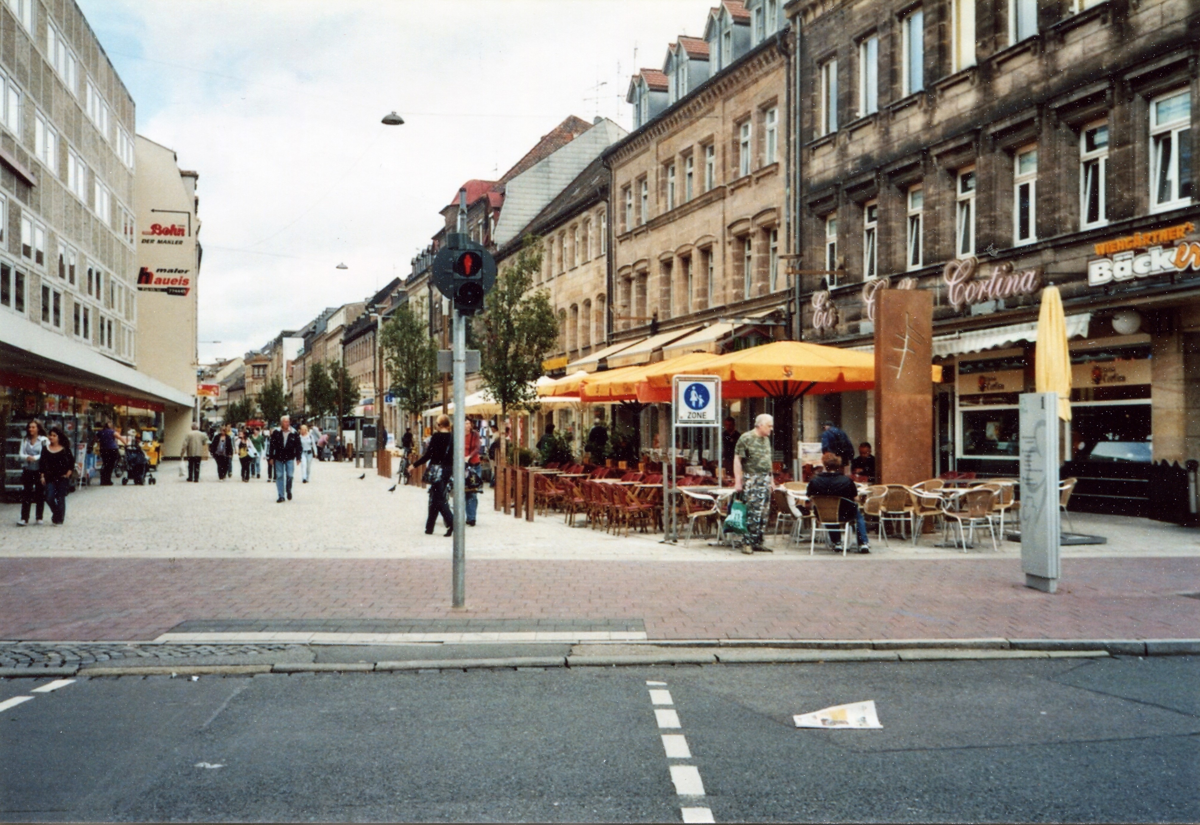 | Beschreibung | Blick von der Maxstraße in die Fußgängerzone Schwabacher Straße, diese mit neuer Metallstele (Bronzelegierung), Mai 2009 | ||