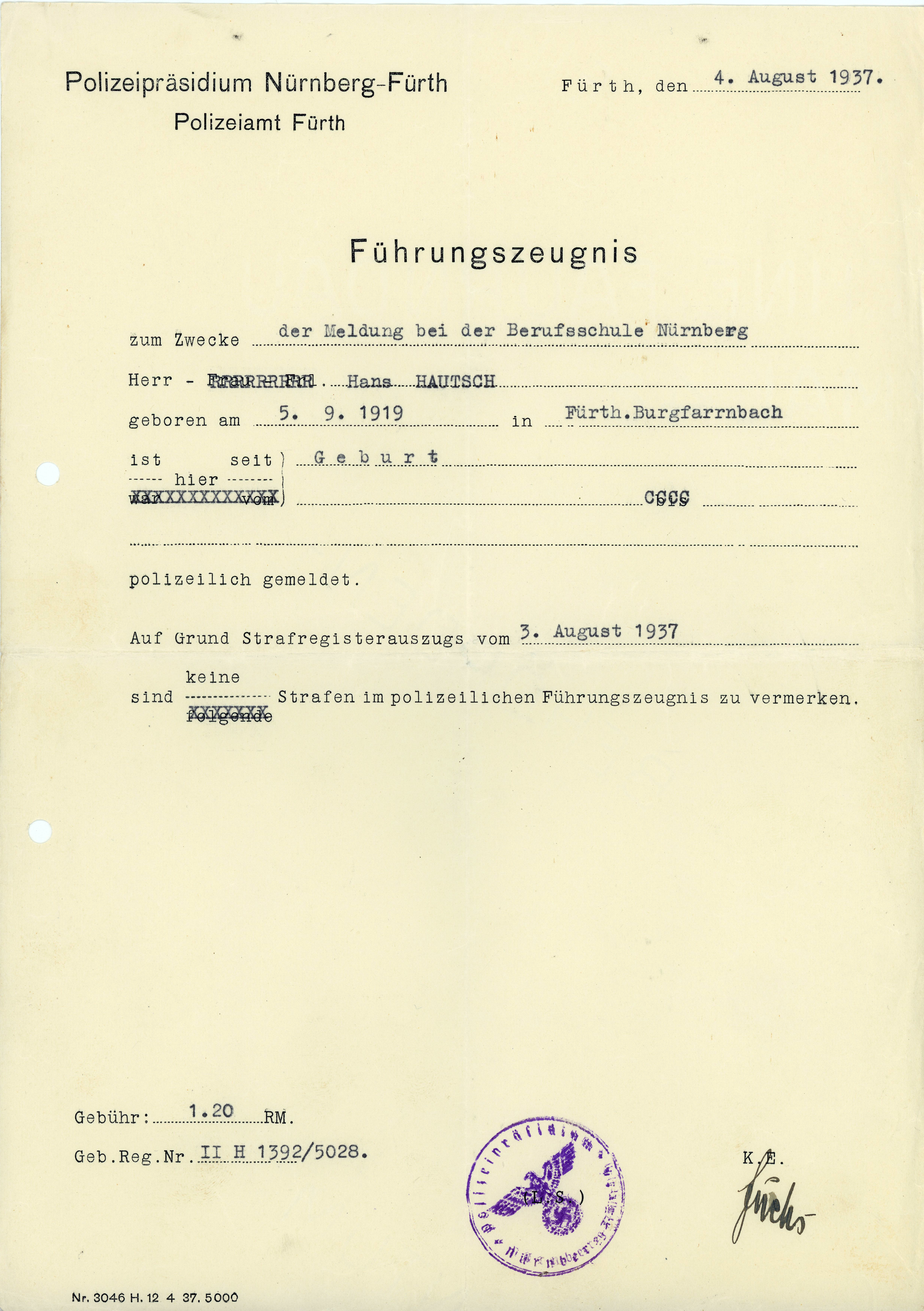 | Beschreibung | Polizeiliches Führungszeugnis aus dem Jahr 1937 | ||
