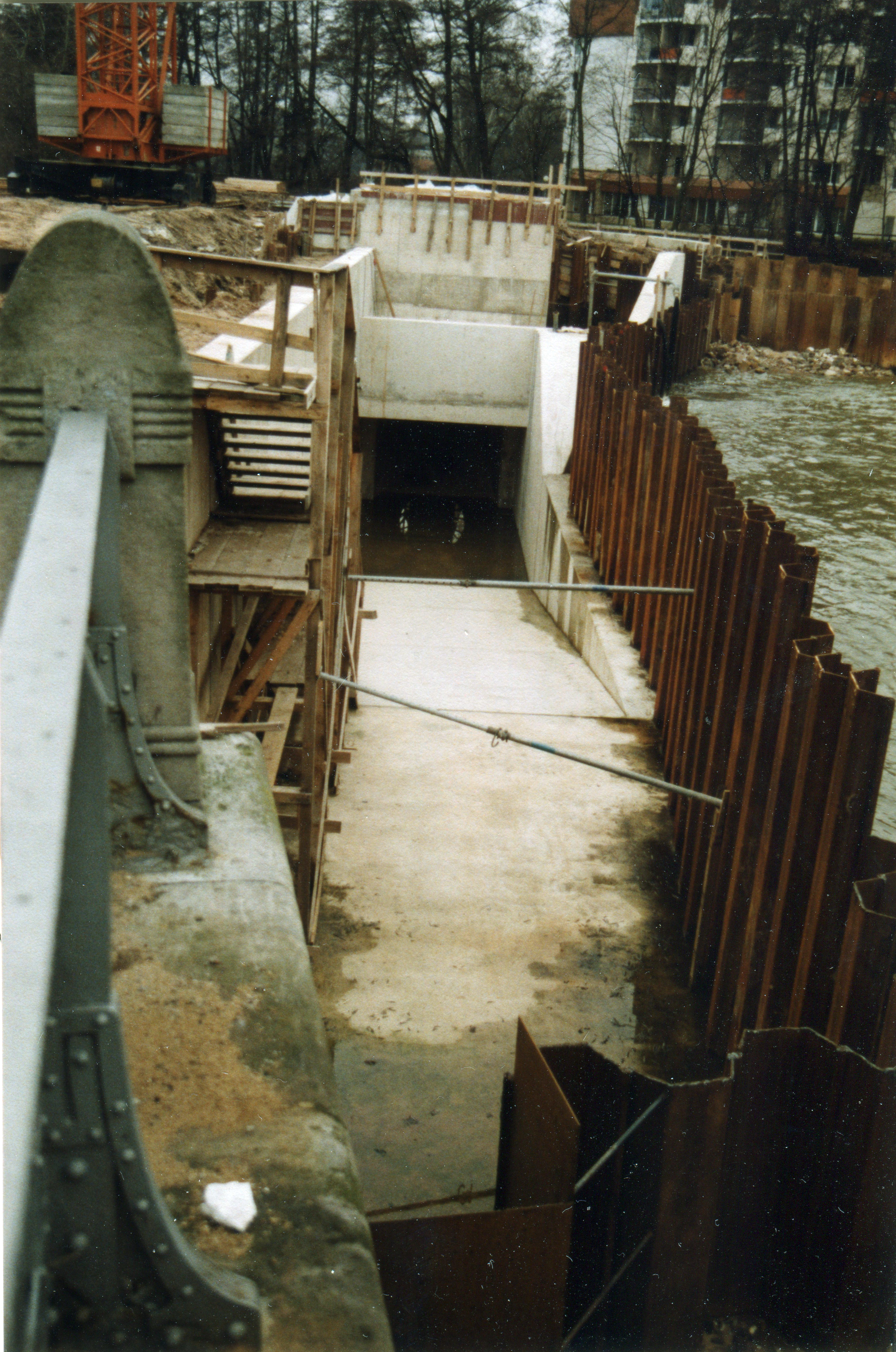 | Beschreibung | Bauarbeiten der Stau- und Triebwerksanlage an der Foerstermühle - im Hintergrund die Senioreneinrichtung Kursana, Jan. 1989 | ||